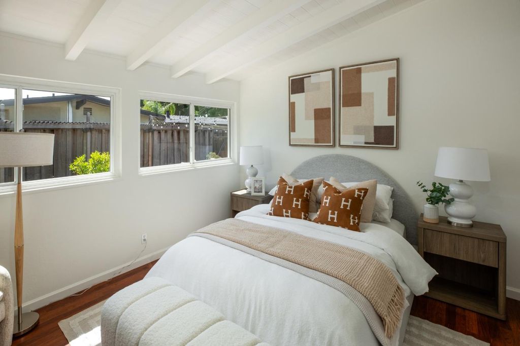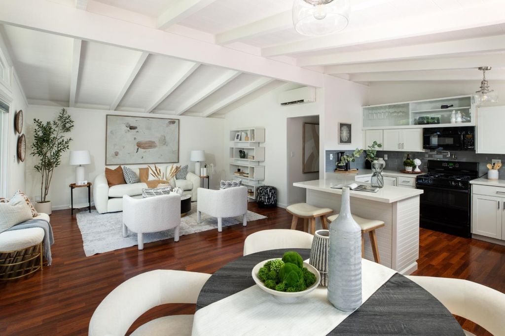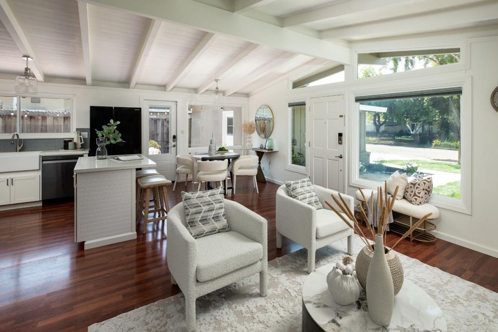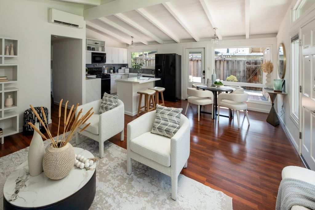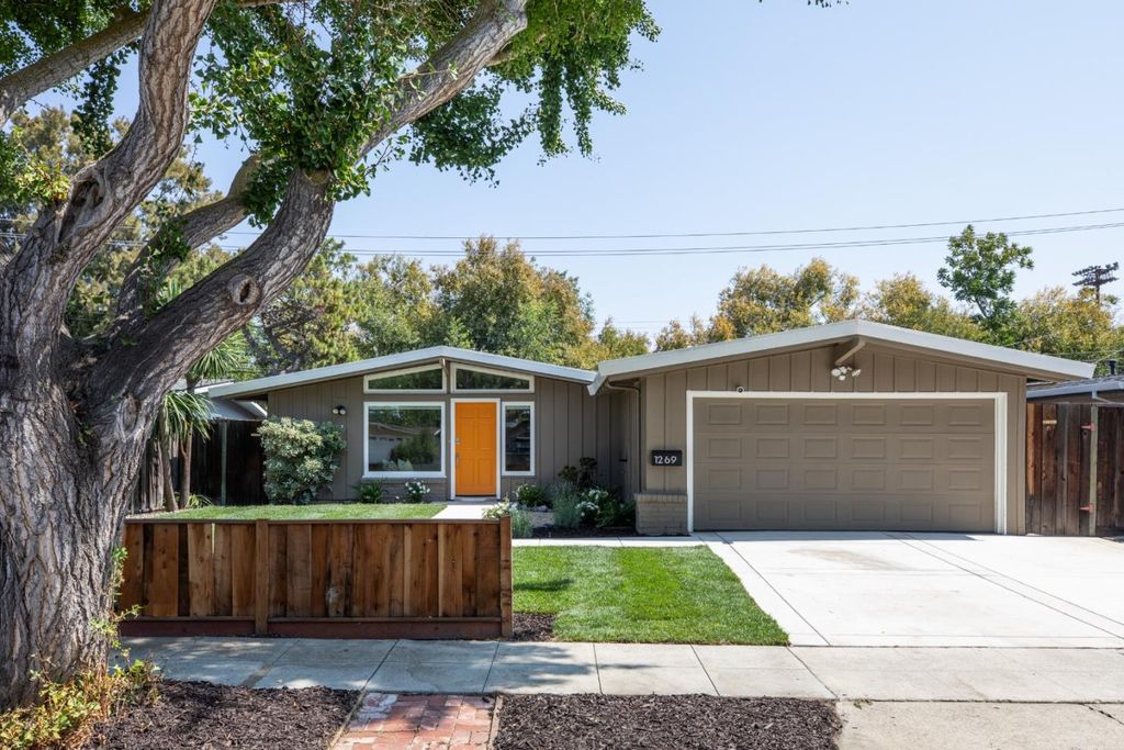 In the heart of Silicon Valley, minutes from Levi's Stadium and Great America, this mid-century modern gem pairs iconic design with fresh updates. A bold orange front door leads to vaulted, beamed ceilings, expansive picture windows, and sleek hardwood floors. The bright white kitchen with island seating flows into open living and dining spaces; this main hub connects effortlessly to a patio and newly landscaped yard. Exterior decorative lighting adds a festive element for easy and enjoyable indoor-outdoor living. This 3 bedroom and 2 bath home includes a remodeled primary suite, plus mirrored closets and ample storage; comfort meets style at every turn. Outside, enjoy newly landscaped front and back yards with attractive fencing. Added perks include an individual room heating/AC system on remote control, tankless water heater, gourmet hot water faucet over range, and a detached 2-car garage with epoxy flooring. Newly painted inside this home is ready to move right in. Unbeatable access to top tech hubs and major commuter routes, this location delivers the ultimate Silicon Valley lifestyle.