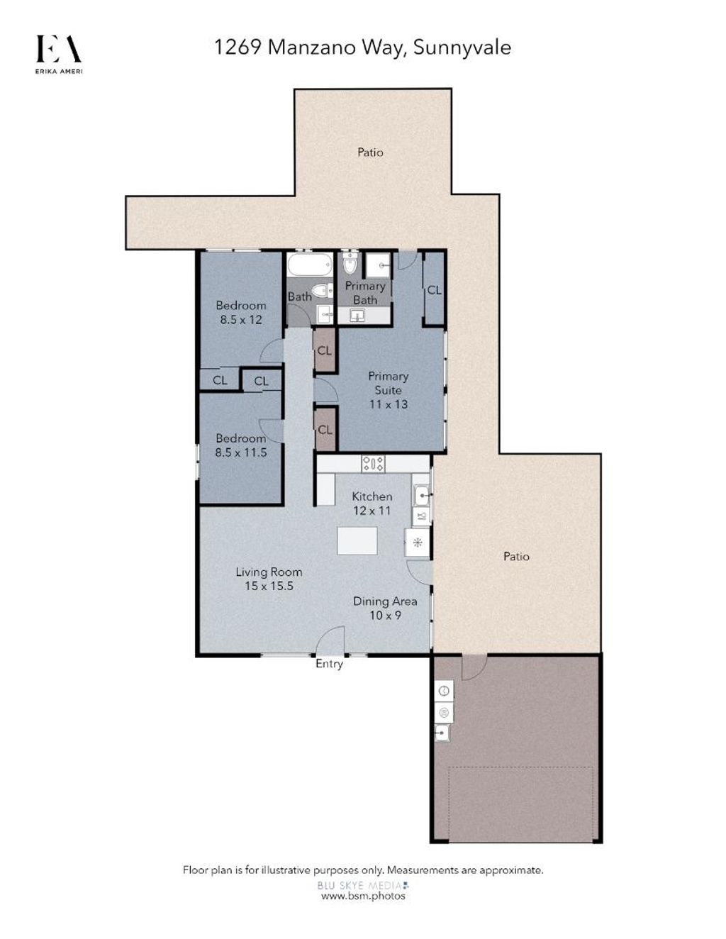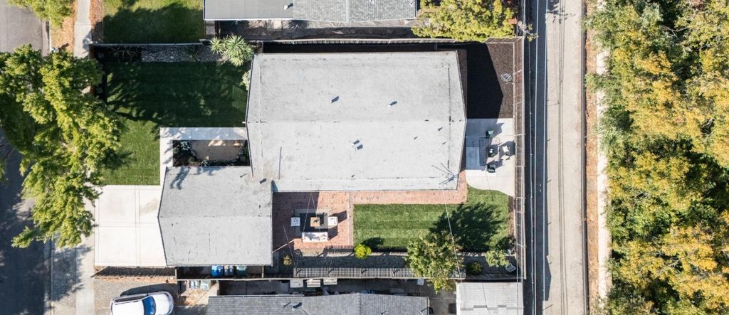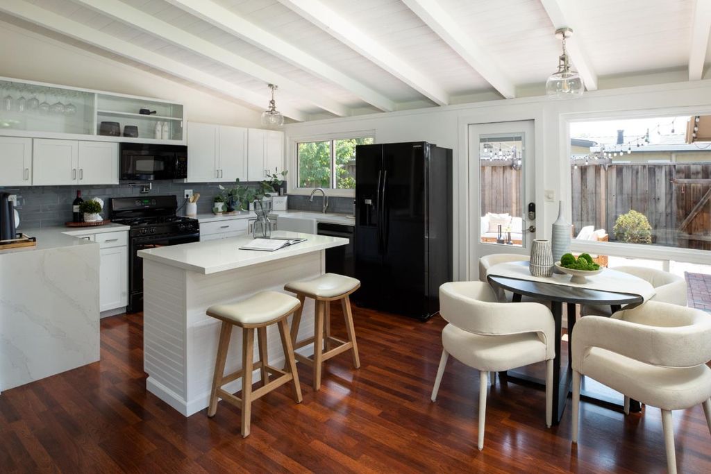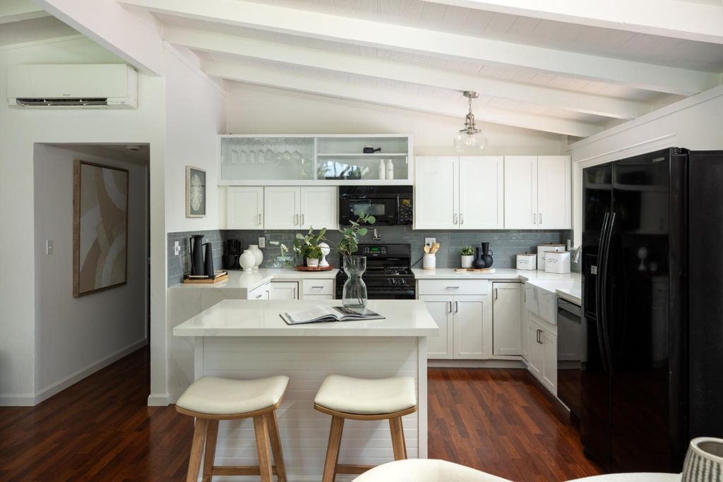 In the heart of Silicon Valley, minutes from Levi's Stadium and Great America, this mid-century modern gem pairs iconic design with fresh updates. A bold orange front door leads to vaulted, beamed ceilings, expansive picture windows, and sleek hardwood floors. The bright white kitchen with island seating flows into open living and dining spaces; this main hub connects effortlessly to a patio and newly landscaped yard. Exterior decorative lighting adds a festive element for easy and enjoyable indoor-outdoor living. This 3 bedroom and 2 bath home includes a remodeled primary suite, plus mirrored closets and ample storage; comfort meets style at every turn. Outside, enjoy newly landscaped front and back yards with attractive fencing. Added perks include an individual room heating/AC system on remote control, tankless water heater, gourmet hot water faucet over range, and a detached 2-car garage with epoxy flooring. Newly painted inside this home is ready to move right in. Unbeatable access to top tech hubs and major commuter routes, this location delivers the ultimate Silicon Valley lifestyle.