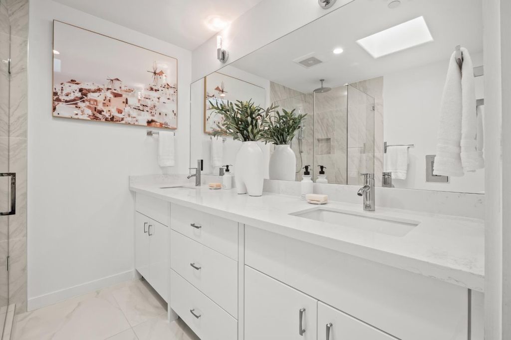Intention and elevated style, this modern 4-bed, 3-bath home delivers the design, comfort, and quality todays buyers crave. Remodeled in 2020 but thoughtfully reimagined by the current owners, it feels modern, cohesive, and ready to enjoy. An airy open-concept layout welcomes you with vaulted ceilings, skylights, and recessed lighting that fill the home with natural light. The integrated sound system enhances both everyday living and effortless entertaining. The designer kitchen shines with Quartz countertops, a sleek porcelain backsplash, and premium appliances including a Samsung gas range, Bosch dishwasher, and Sharp drawer microwave. Winston White cabinetry pairs beautifully with Imperial Green shaker cabinets on the island and serving bar, accented with chic gold knurled hardware for a truly custom look. Outside, the curb appeal is dialed in with custom hardscaping, low-maintenance succulents, blooming Pink Jean May Camellias, and Green Tower Boxwoods. Two modern Veradek planters with auto-irrigation complete the polished aesthetic. Discover this beautiful North Shoreview home, where unexpected style and thoughtful design come together effortlessly.
