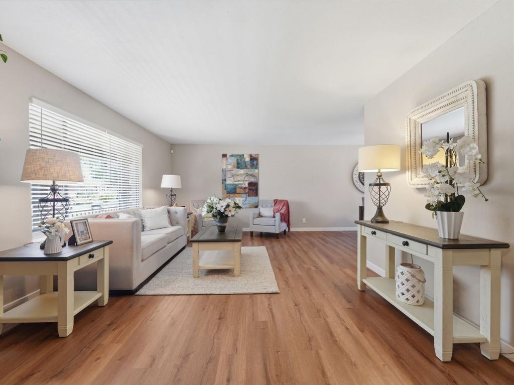This 4-bedroom, 2.5-bath home is ideally situated on a cul-de-sac just blocks from Cottle Park. Bright and inviting living and dining rooms are complemented by a separate family room and an eat-in kitchen, offering a comfortable and functional layout. The kitchen opens to a spacious backyard deck, perfect for effortless indoor-outdoor entertaining. A step-down family room with a fireplace provides a cozy gathering space and features direct access to the backyard. This level also includes a half bath, laundry room, and access to the two-car garage. Upstairs, new carpet enhances four generously sized bedrooms, including an ensuite primary suite. Three bedrooms feature walk-in closets, providing ample storage. Conveniently located near Oakridge Mall, Highway 85, Blossom Hill Road, shopping, and schools, this home offers both comfort and accessibility.