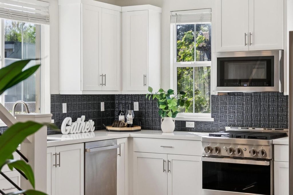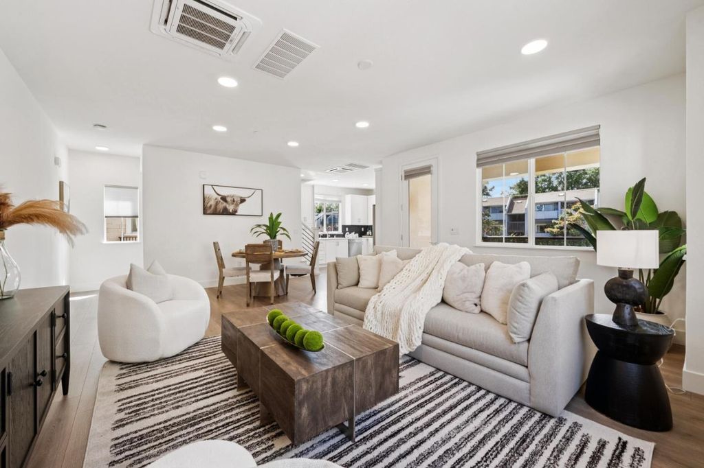 Welcome to 663 Alamo Ct, built 2021, this stylish 3-bedroom, 2.5-bath townhome in Mountain View offering 1,439 sq ft of modern living. Featuring LVP flooring in the main living areas, Multi Zone Central A/C, and a Bright open layout, this home is Designed for Comfort and Convenience. The kitchen boasts Quartz Countertops, Tiled Backsplash, and S/S appliances including LG and JennAir. Spacious Family room opens to a Large Private Balcony, perfect for Relaxing or Entertaining. Upstairs, the Primary suite includes a Walk-in Closet and a Sleek en-suite Bathroom. Two additional bedrooms, a Full Bath, and in-unit Laundry complete the Upper Level. Additional highlights include an Attached 2 Car Side by Side Garage with EV charger, Extra storage, and HOA amenities covering exterior maintenance, BBQ area, and playground. Ideally located near Castro Street, Whisman & Shoreline Park, major Tech campuses like Google, Microsoft and LinkedIn, and Top Schools including Mountain View High School, with Easy access to Highways 101, 85, Central Expressway and Caltrain, Trails & Bike Routes