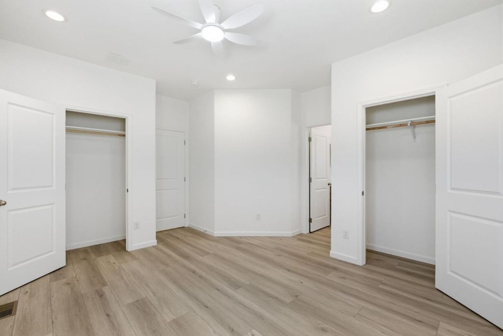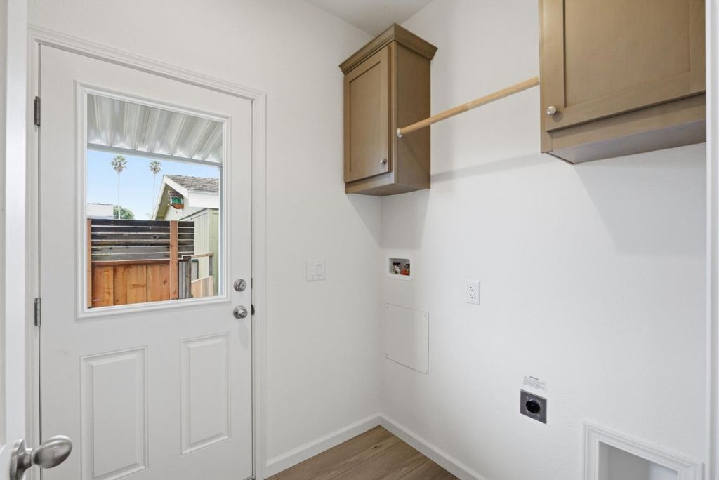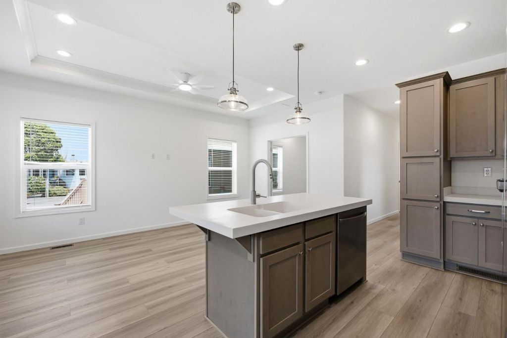 New 2026 home in Shoreline Estates, a 55+ community in Live Oak. 2-bedroom, 2-bath floor plan with den, open living area, recessed ceiling detail, recessed lighting, ceiling fan, and wide-plank flooring in the main living spaces. The kitchen includes an island with a sink, bar seating, gray cabinetry, and stainless steel appliances. The utility room offers a laundry area and extra storage. Bathrooms feature quartz-style counters, and the hall bath includes a tub/shower combo. Near Sunny Cove Beach, local restaurants, shops, breweries, and the Live Oak/Eastside Farmers' Market. Easy access to shopping and Highway 1.