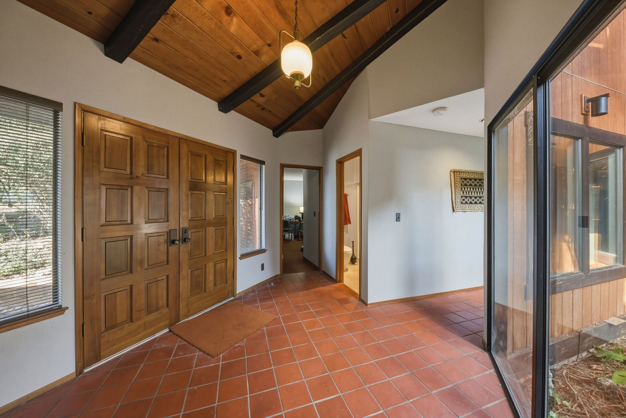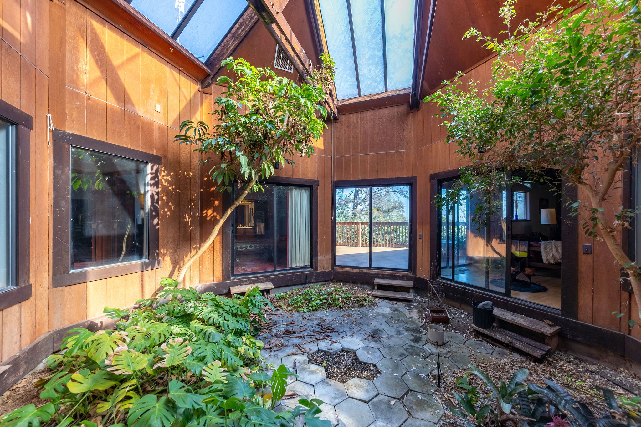 Step through the double-door entry into a bright, architecturally striking interior defined by soaring wood ceilings with exposed beams. The dramatic foyer opens to a stunning central octagonal atrium, featuring windows or sliding doors on all sides, expansive skylights above, and an indoor garden below—filling the home with natural light and a seamless indoor-outdoor connection.
