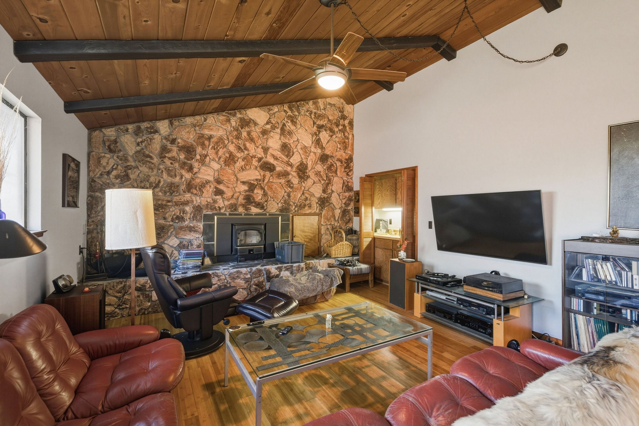 large view deck occupies the space between the upper wings, offering spectacular Bay vistas—ideal for relaxing or entertaining. The upper right wing hosts a spacious living room with vaulted ceilings, hardwood floors, a cozy fireplace set into a rustic stone wall, and a wet bar. Adjacent is an elegant dining room, perfect for formal gatherings.