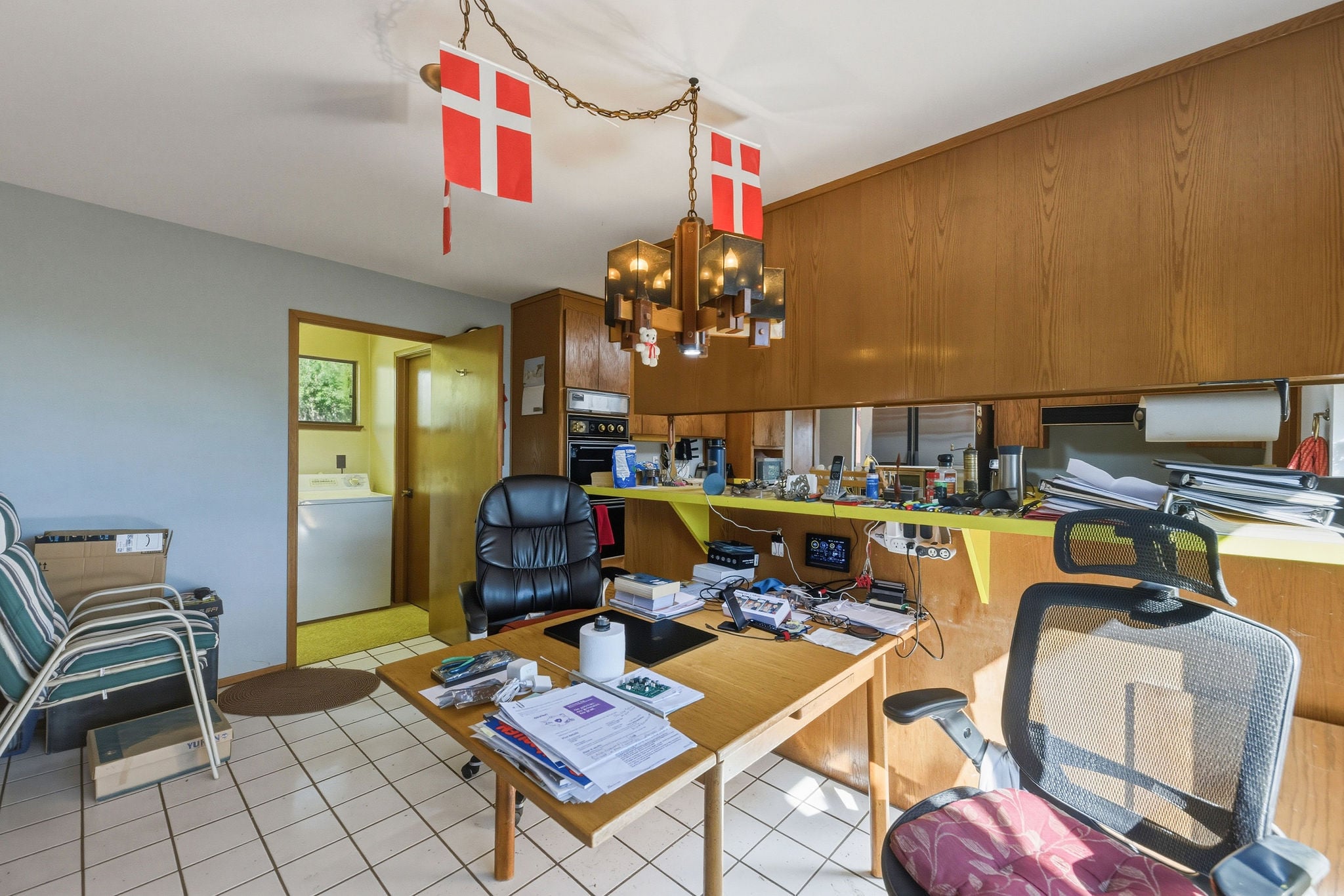 The lower right wing features a well-appointed kitchen with abundant cabinetry, a center island, breakfast bar, and a charming breakfast nook with sliding doors to a side deck—perfect for alfresco dining. Steps lead down to a landscaped