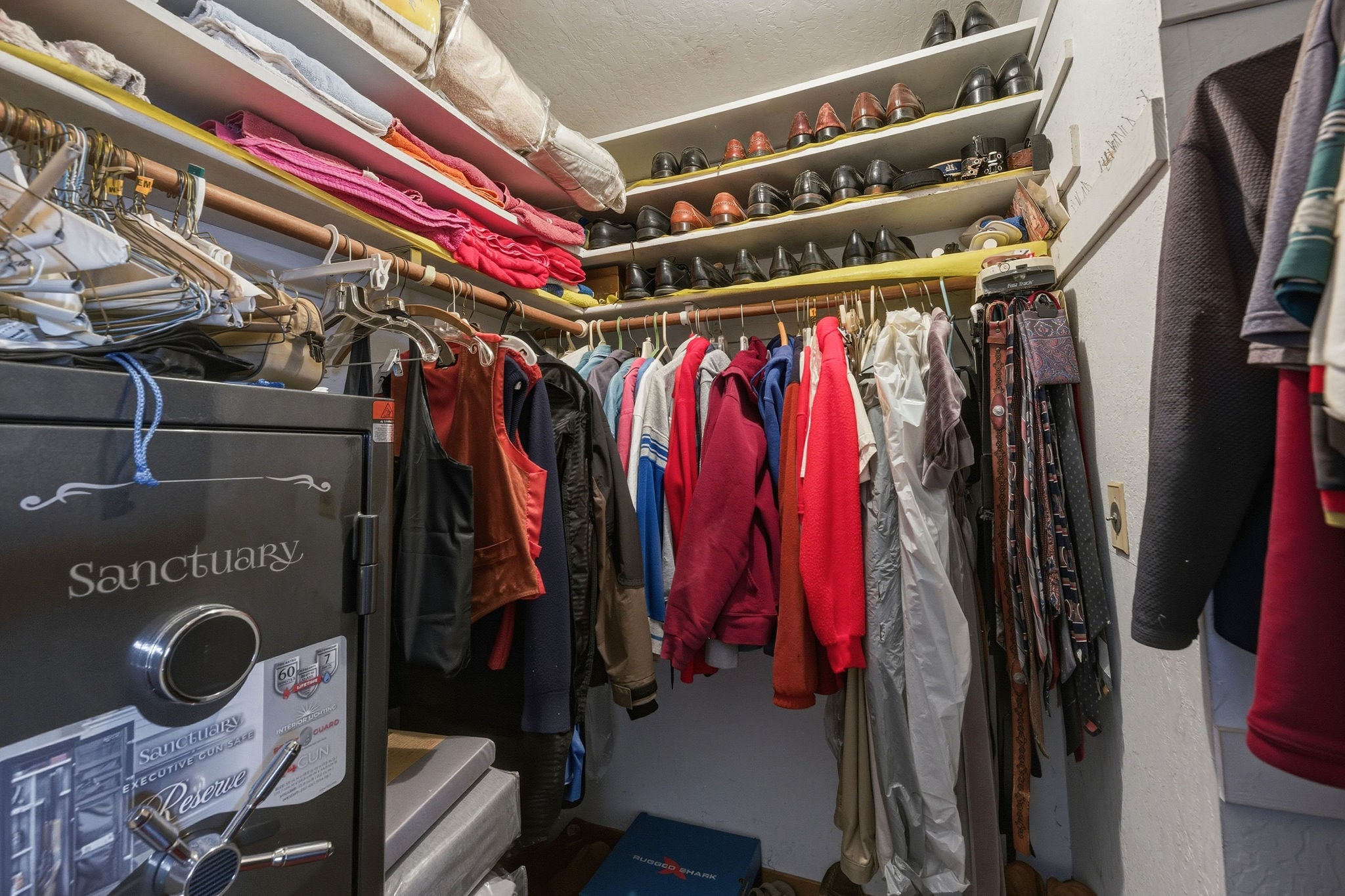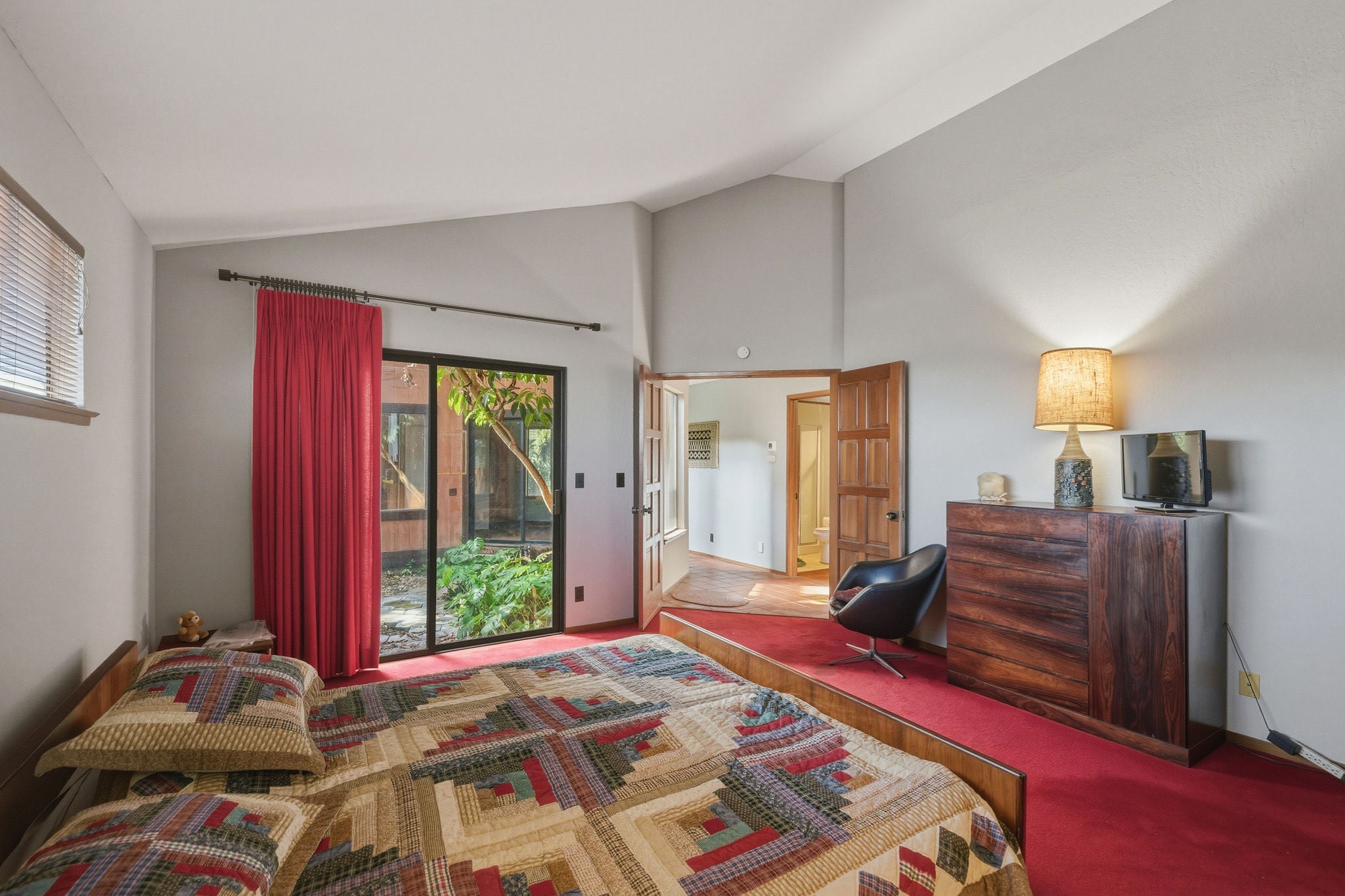 to the private living quarters, offering four bedrooms and three bathrooms. The primary suite boasts a high ceiling, direct access to