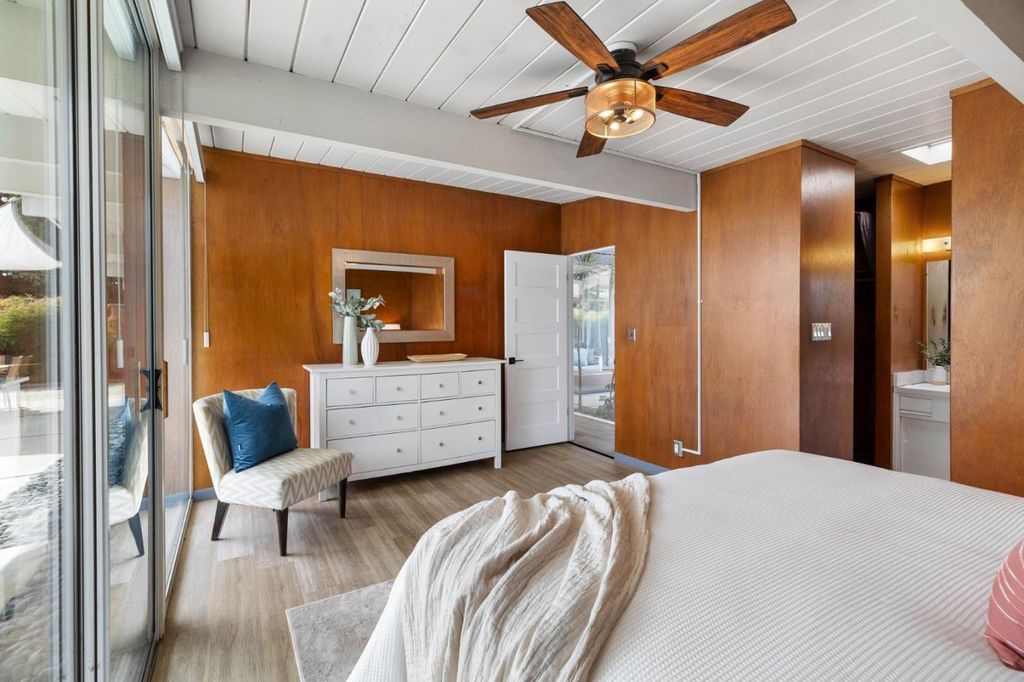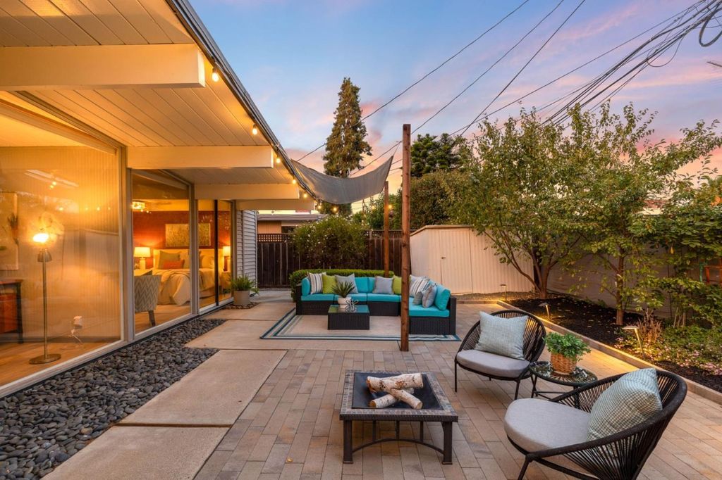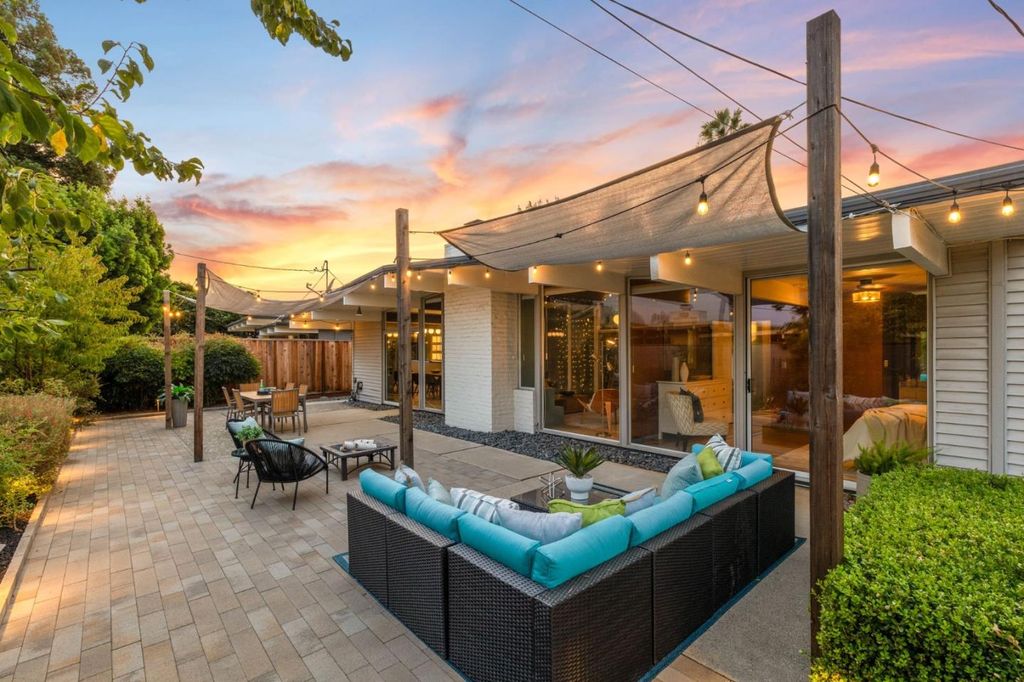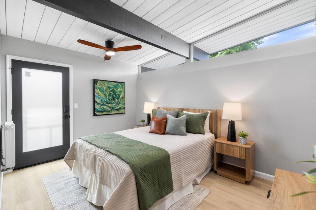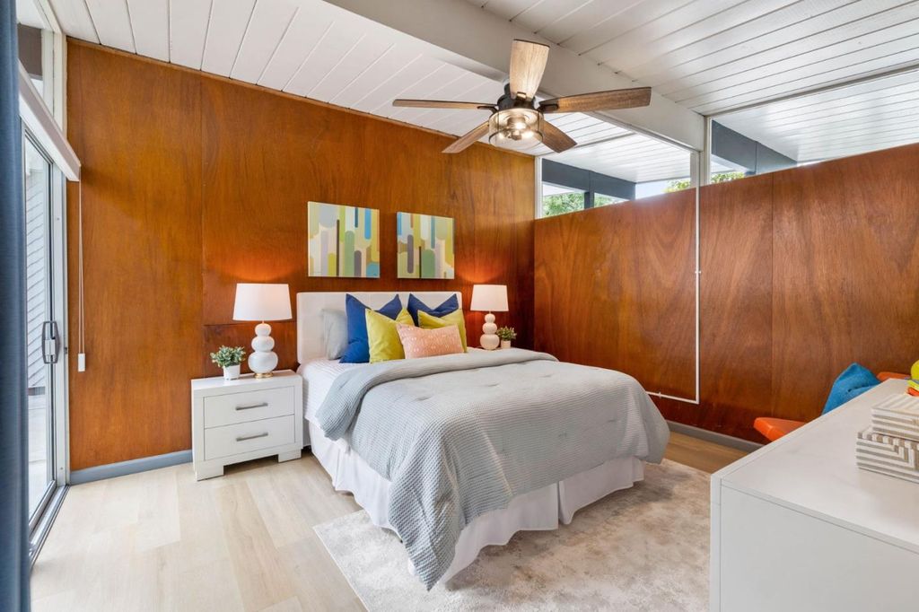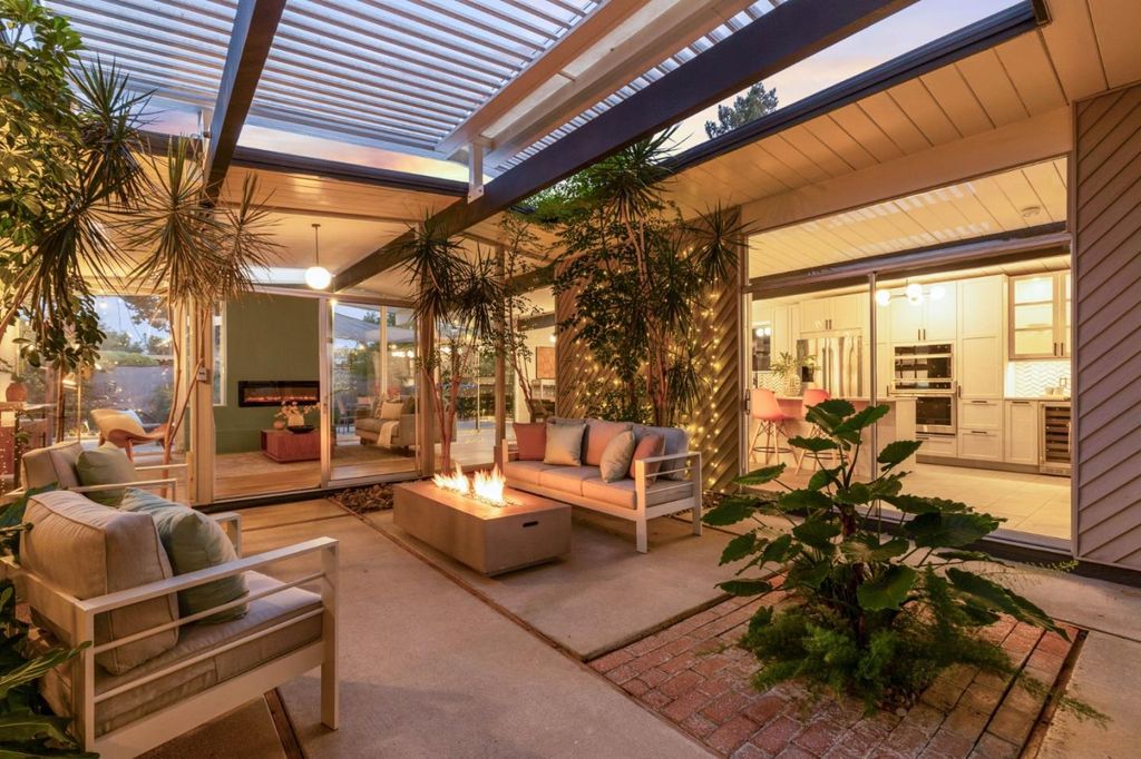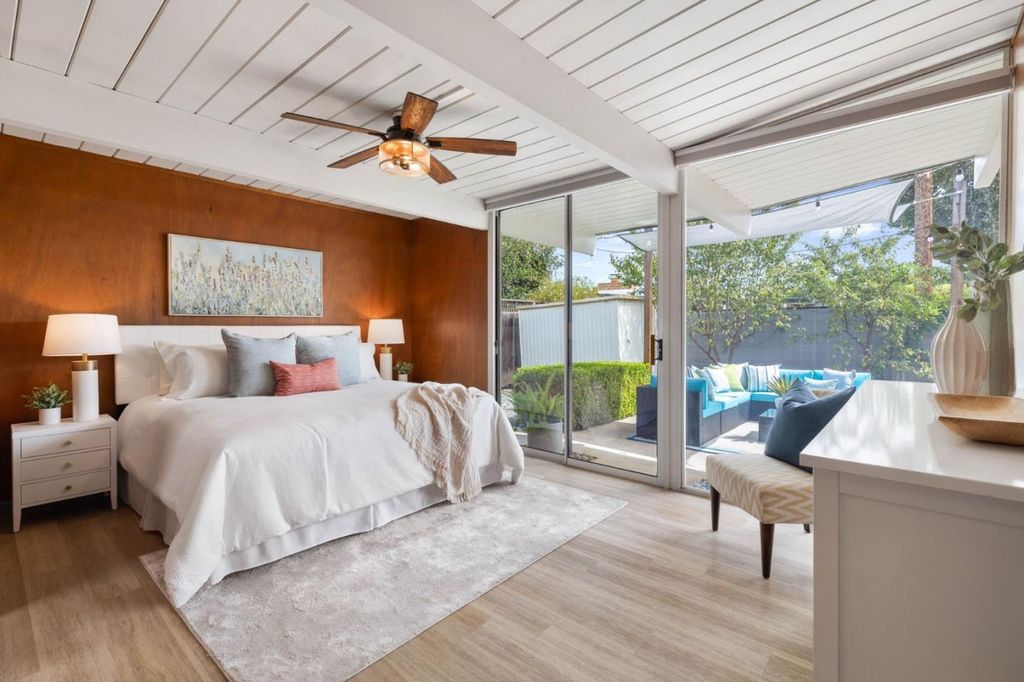 Gorgeous home designed by Joseph Eichler in Historic Fairglen Neighborhood where Mid-century modern meets today's luxury in this beautifully updated 5BR/3BA home. This home features a fully remodeled kitchen with high end/wi-fi enabled smart appliances, Miele hood & dishwasher, Bosch fridge, GE Monogram induction cooktop & oven with air-fry, built-in microwave, quartz countertops, custom cabinetry, and tile backsplash that echoes Eichler's signature aesthetic. Smart home features abound, including smart switches, GE Whole House Water with water consumption, vacation, & everyday leak sensor through an app, smart lighting, & more. Energy efficient upgrades include owned Tesla Solar & Battery system, 220V EV charger, a three-zone control Viessmann radiant heating system for optimal comfort and efficiency. A newly added 5th bedroom with ensuite bath & private entrance offers ADU potential. Enjoy designer bathrooms with the primary ready for your personal touch, organized custom closets, upgraded electrical panel, and beautifully drought tolerant landscaped front & backyard. All while staying true to the classic Eichler aesthetic atrium entry with unique louvered roof, original mahogany paneling, globe lighting, and iconic open-concept living with abundance of natural light.