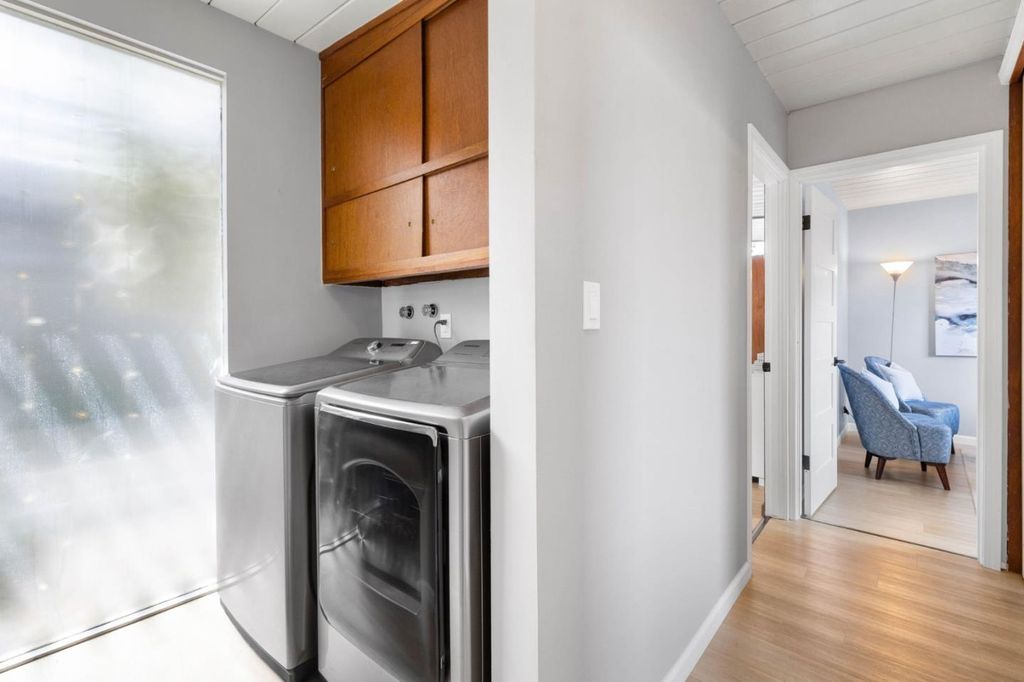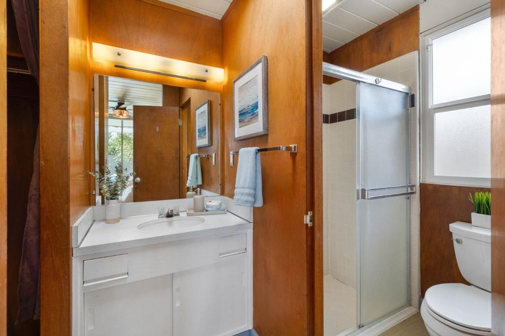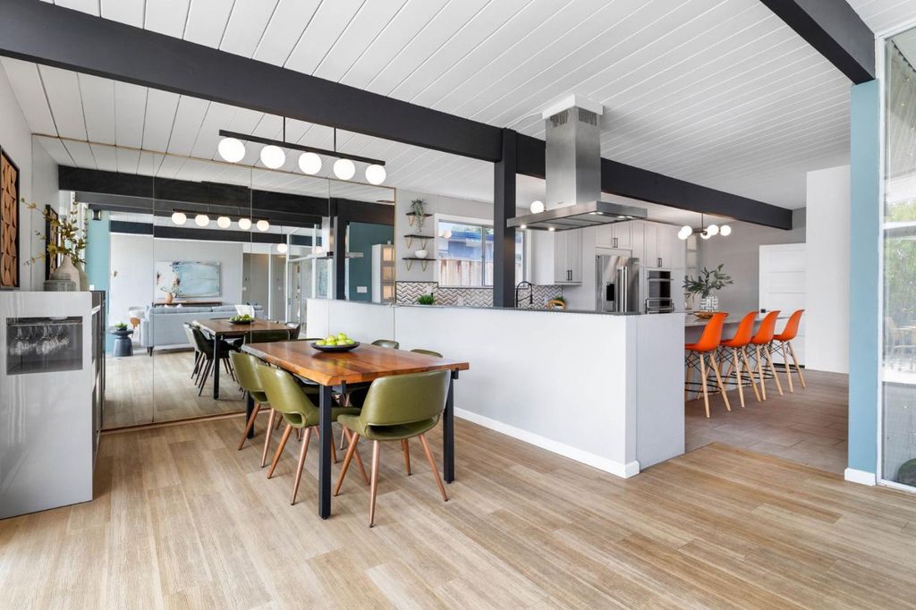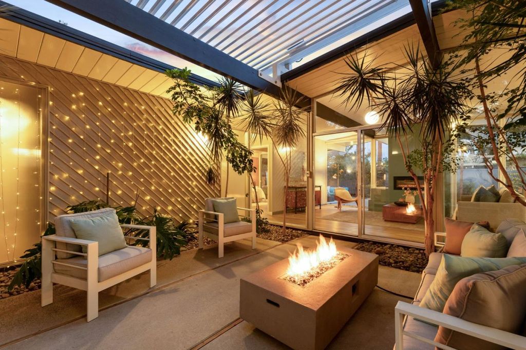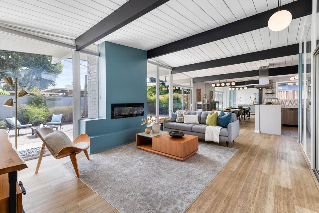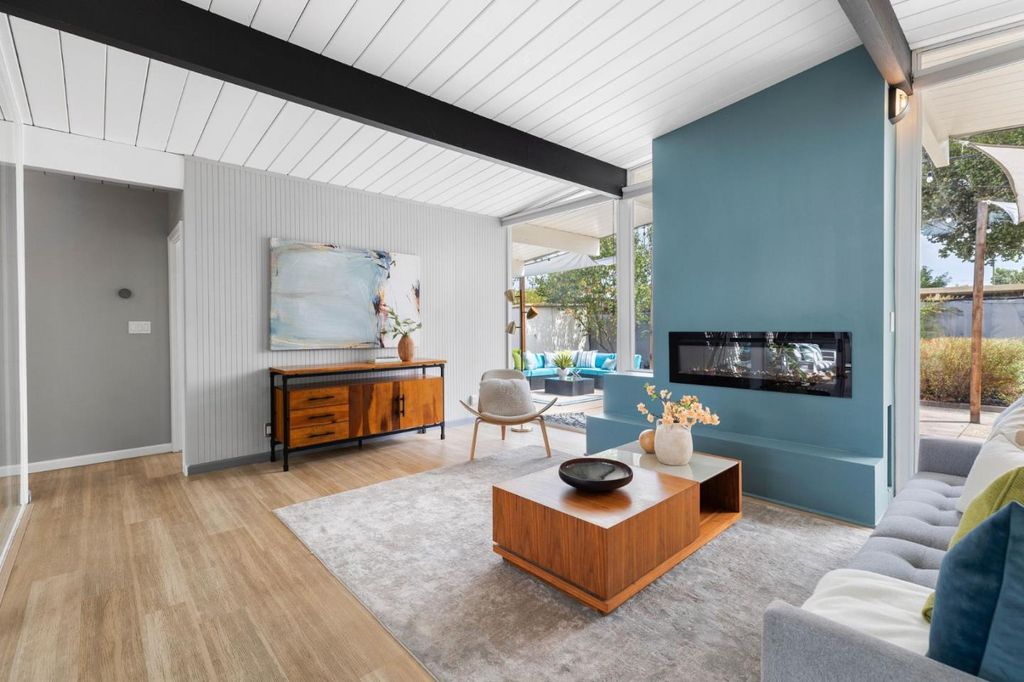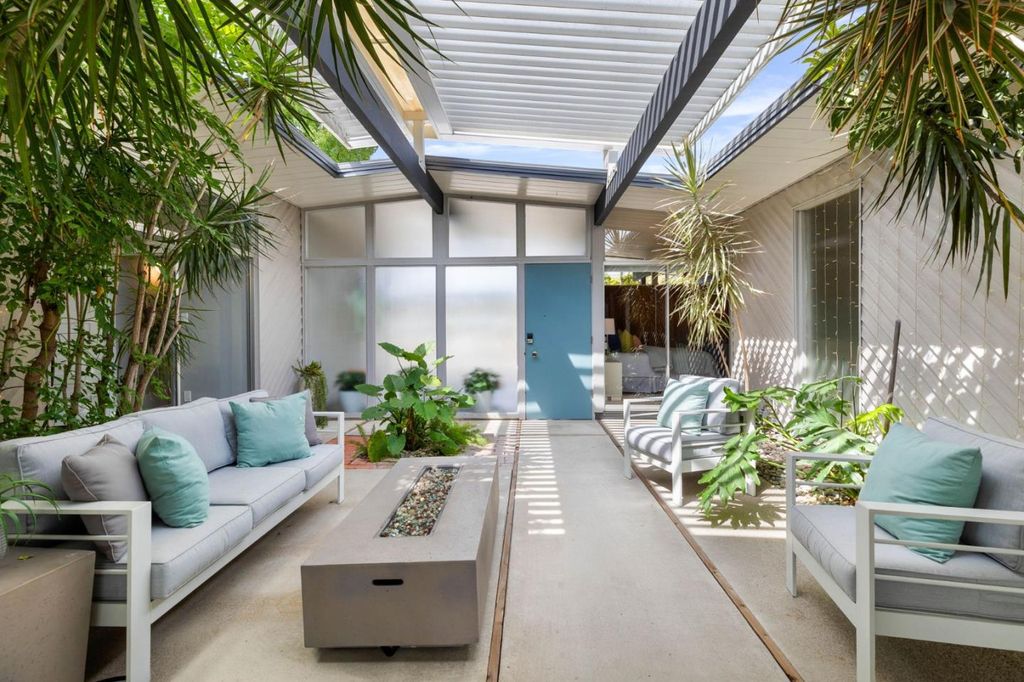Gorgeous home designed by Joseph Eichler in Historic Fairglen Neighborhood where Mid-century modern meets today's luxury in this beautifully updated 5BR/3BA home. This home features a fully remodeled kitchen with high end/wi-fi enabled smart appliances, Miele hood & dishwasher, Bosch fridge, GE Monogram induction cooktop & oven with air-fry, built-in microwave, quartz countertops, custom cabinetry, and tile backsplash that echoes Eichler's signature aesthetic. Smart home features abound, including smart switches, GE Whole House Water with water consumption, vacation, & everyday leak sensor through an app, smart lighting, & more. Energy efficient upgrades include owned Tesla Solar & Battery system, 220V EV charger, a three-zone control Viessmann radiant heating system for optimal comfort and efficiency. A newly added 5th bedroom with ensuite bath & private entrance offers ADU potential. Enjoy designer bathrooms with the primary ready for your personal touch, organized custom closets, upgraded electrical panel, and beautifully drought tolerant landscaped front & backyard. All while staying true to the classic Eichler aesthetic atrium entry with unique louvered roof, original mahogany paneling, globe lighting, and iconic open-concept living with abundance of natural light.