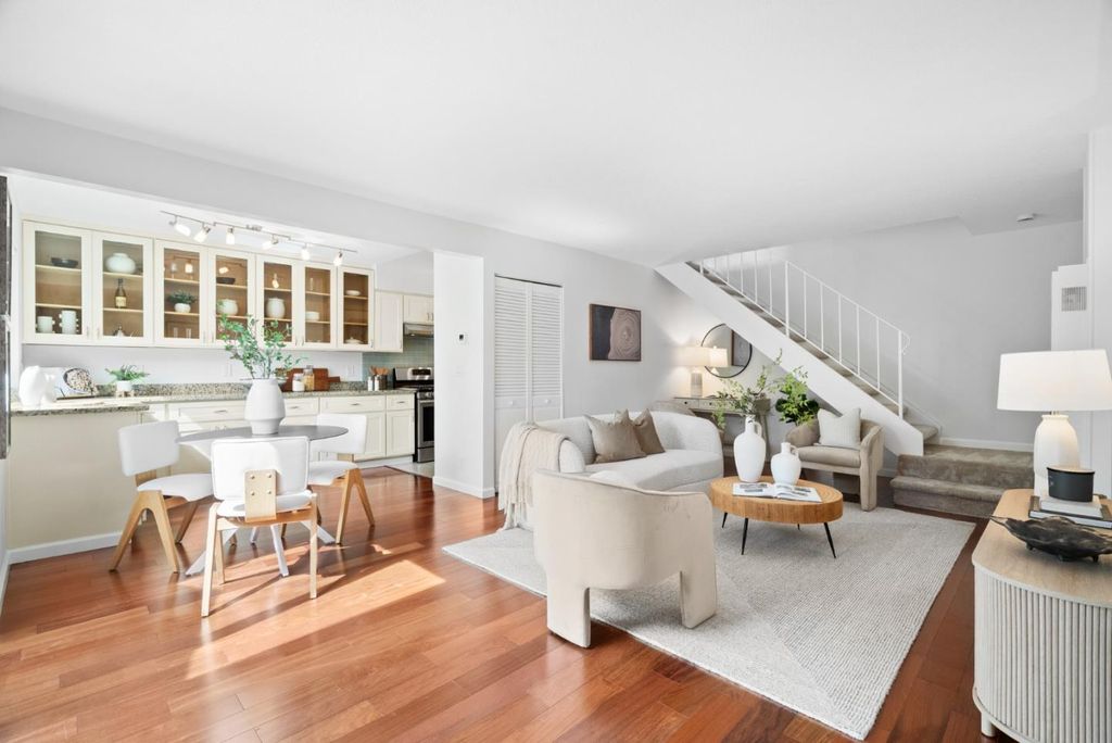 Welcome home! Charming updated 2-story townhouse blends comfort and modern elegance, balancing form and function. Open floor plan on the main level allows the living room, dining area, and the kitchen to flow seamlessly. Spacious 2 BR on the upper level - large primary suite with walk-in closet. Delightful patio provides private outdoor space. Upgrades: In-unit laundry with stack washer & dryer, dual-pane windows & sliding door, new interior doors and closet doors, copper piping, new carpet, fresh interior designer paint. Assigned 1-car garage parking with nearby dedicated storage closet. Residents have access to community amenities swimming pool, clubhouse, playground. Conveniently located near top schools, restaurants and shops, Light Rail, Silicon Valley employers, and major commute routes.
