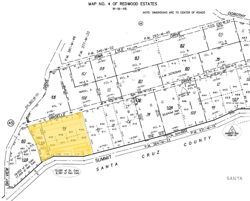 Rare opportunity to purchase 2 adjacent undeveloped lots on Summit Rd, just 1 mile from Hwy 17, 10-12minutes from downtown Los Gatos. 2 APNS totaling over 1.13 acres = 40,000 SF APN 544-48-098 + 9,391 SF APN 544-48-110. List price is for BOTH APNs! Seller prefers to sell the lots together but they may be developed or resold separately. Buyer to investigate possibilities for lot line adjustment. Lots of upside here, there are many high end homes and estates along Summit Rd. This is very usable oak-studded land, with a huge level area off Summit, sloping gently down to Virdelle and adjacent Good Neighbor Park. 260-270 ft frontage on both streets. San Jose Water in the street, PG&E power pole on the property, Comcast available. Septic will be required (no investigations done). Redwood Estates offers the 'Pavilion at Redwood Estates' event venue, USPS Post Office, Redwood Store, popular Pizzeria Vittoria (formerly Nonnos), 2 community parks, swimming pool, and Redwood Fire Station. Redwood Estates is a Firewise USA Community. Award winning Los Gatos schools - Lexington Elementary, Fisher Middle, Los Gatos High! Lexington Elementary is the only school in the LGUSD offering the International Baccalaureate Primary Years & Early Years TK programs.