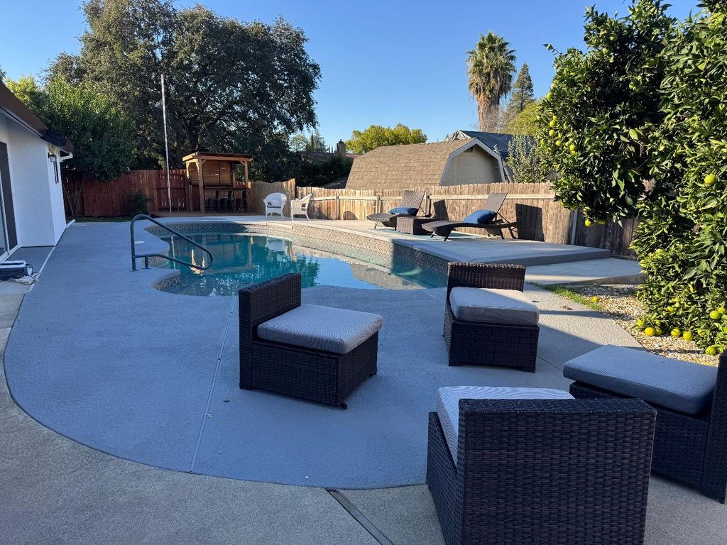 If you have an RV, boat, work trucks, or multiple vehicles, this is the home for you! The expansive paved areas surrounding this property offer incredible flexibility, perfect for parking toys, hosting summer gatherings, or creating your own private outdoor retreat. Inside, soaring cathedral ceilings highlight the open concept great room, seamlessly connecting a spacious kitchen with abundant cabinetry, a beautiful oversized island, a dining area, and a warm family room that invites connection and comfort. The primary suite features wall to wall closets, a cathedral ceiling, and direct access to the backyard oasis. Its ensuite bathroom showcases dual sinks and a luxurious walk-in shower. Three additional bedrooms provide comfort for family or guests, along with an indoor laundry room with extra cabinets and a garage equipped with built-in storage. Step outside to an entertainers paradise complete with a resurfaced pool featuring a Baja shelf, a tiki-style bar, a relaxing spa, and a huge storage shed for all your gear. Enjoy fruit trees including oranges, pomegranate, cherry and Meyer lemon, plus a blueberry bush and chili plants. This home replaces grass with pure functionality, style, and fun. Perfect for those who love to entertain, value space and embrace California living.