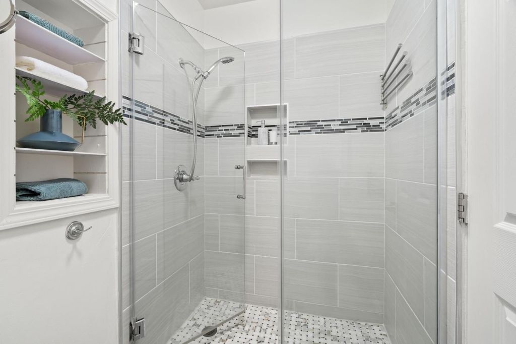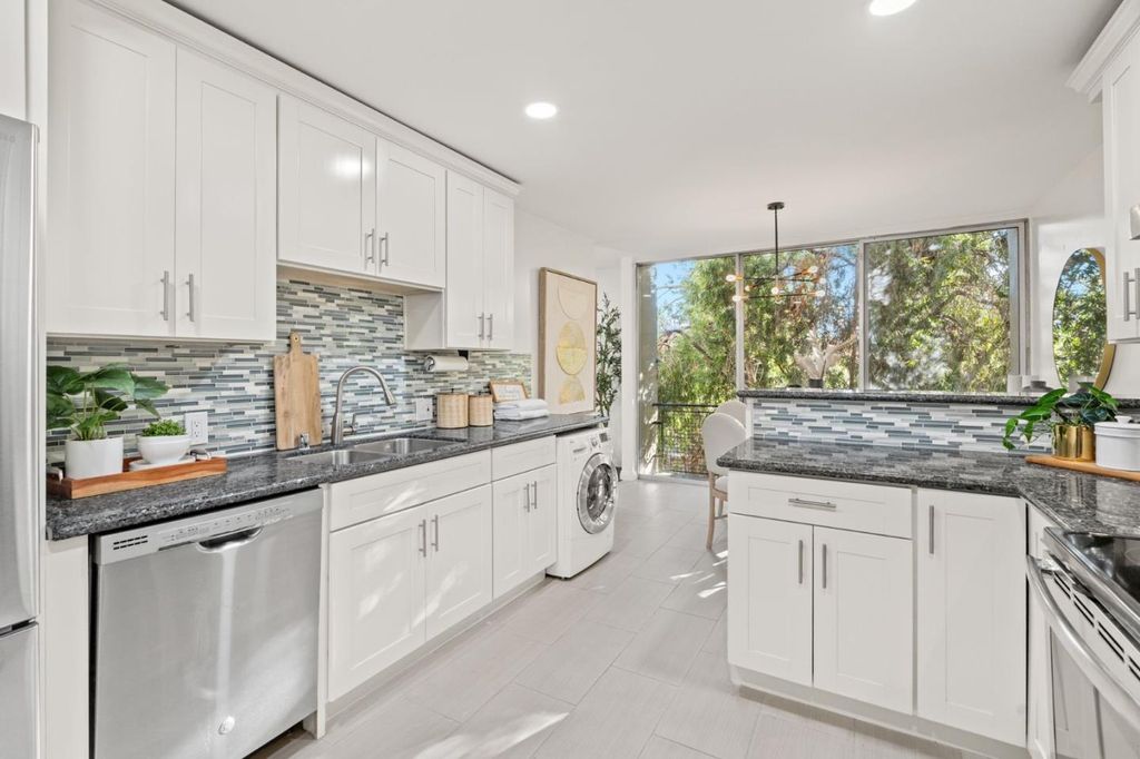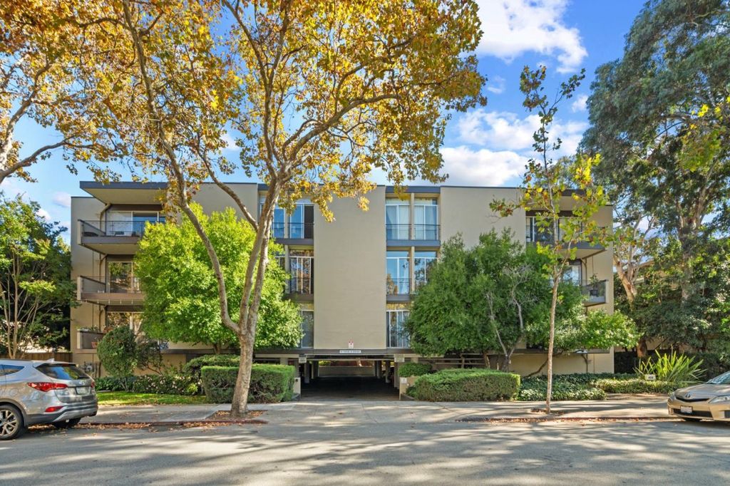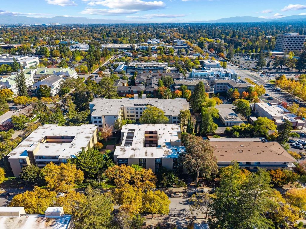 Blocks away from California Ave, minutes from Stanford, this updated end-unit is open & bright and is one of very few units in the complex with A/C system. New mini-split units have been installed in each room with HOA approval and city permits providing both heating & cooling in addition to the radiant heating system. Abundance of natural lights flow throughout every corner with floor-to-ceiling glass. Spacious living room features recessed lights and sliding doors to a spacious balcony overlooking the interior of the community. Dining area, open to kitchen has entire wall of sliding glass doors to a balconette with gorgeous tree view and complete privacy. Updated kitchen features white cabinetry topped in granite slab and stainless steel appliances. Bedrooms are located in a separate wing, highlighted by a primary bedroom suite with walk-in closet, updated en-suite bath and baclonette with tree views and complete privacy. Inside laundry (plus HOA has additional laundry facility). HOA amenities include pool, BBQ area, elevators, bike storage room. HOA covers water, garbage and radiant heating. Designated garage parking plus additional parking space available to rent from HOA plus street parking permit available through the city. Excellent Palo Alto schools.