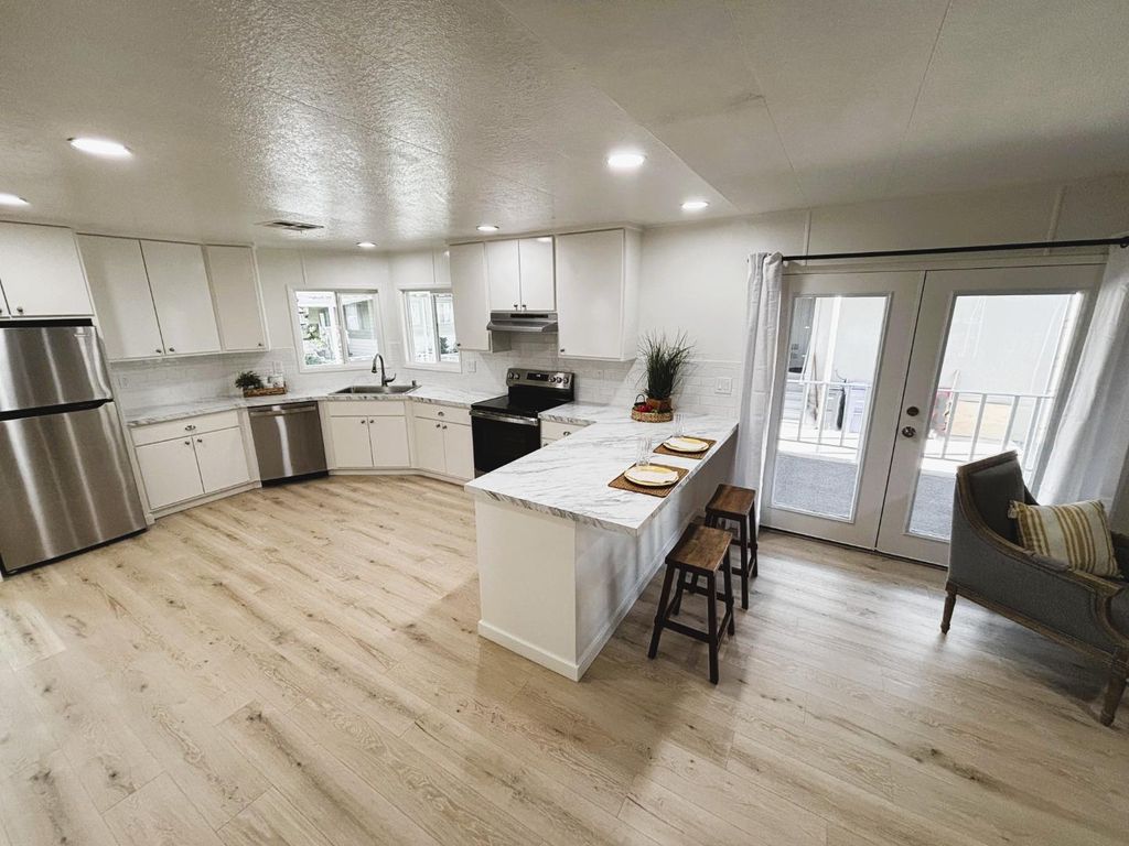 Fully remodeled! No Property Taxes! Low Space Rent! Check out the open-floor plan kitchen and family room with all new white cabinetry, stainless steel appliances, and charming breakfast bar. Double French doors in family room. Spacious living room with large windows for great light. Gorgeous laminate flooring throughout and then warm carpet in the bedrooms. Two bathrooms with charming cabinetry, shower and tub. Double Pane windows. Freshly painted inside and out. Outside you'll find a large deck! Just a quick walk to the community pool and club house. Located in the highly desirable Senior Park, Spanish Ranch Two. Buyers must be 55 years or older and qualify at the park. Close to Bart & other public transportation. Space rent $709/month.
