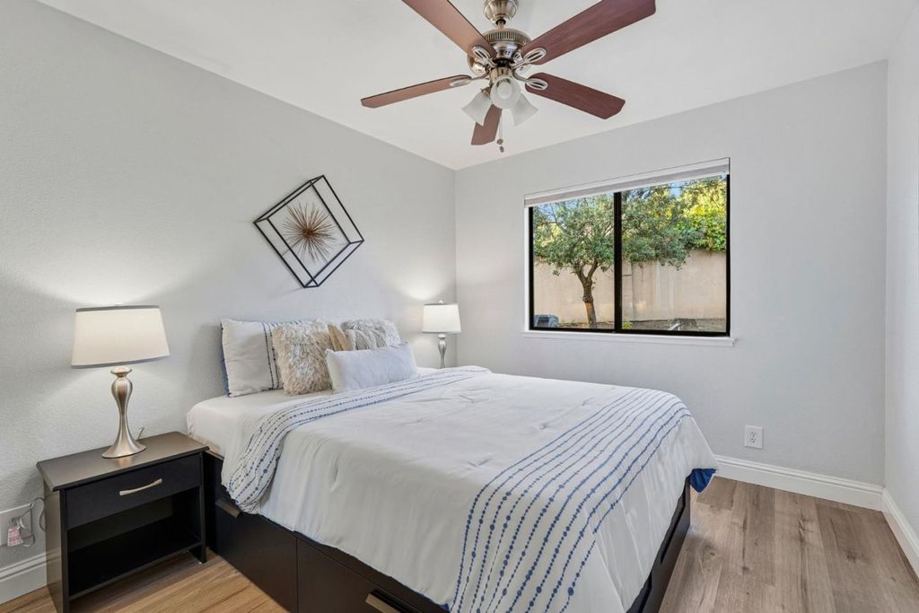 Hillside Sanctuary in the Milpitas Foothills! This turnkey single-story gem stands out with SOARING VAULTED CEILINGS and exposed beams in the living room, family room, and primary suite, creating a rare, open-concept volume unlike standard boxy ranch homes. The modern, light-filled kitchen features sleek quartz counters, a custom tile backsplash, and a sun-drenched greenhouse window. A rolling-shelf pantry and breakfast bar flow seamlessly into the family room, anchored by a cozy fireplace and sliding glass doors. SMART VALUE: Includes a FULLY PAID-OFF SOLAR SYSTEM (owned). Grandfathered into the highly desirable NEM 2.0 rate structure, this transferable asset offers higher export credits than new systems-immediate monthly savings you literally cannot install today. Step outside to a private hillside oasis. The custom deck frames serene hill views, while the lush yard produces blackberries, grapes, apples, and oranges. The primary suite is a true retreat featuring its own SOARING VAULTED CEILINGS, dual closets with custom organizers, and a chic en suite. Extras: A/C, Dual-Pane Windows, and a community pool/spa steps away. Located near Ed Levin Park and top-rated Milpitas schools.