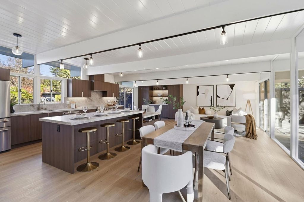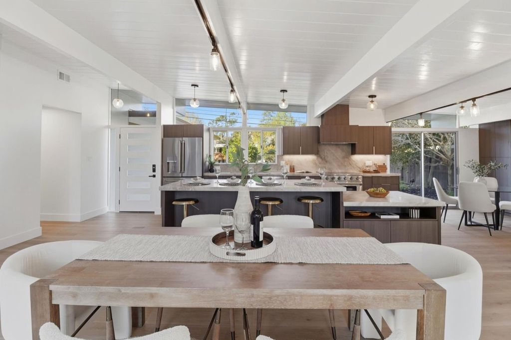 Discover modern California living in this beautifully remodeled Eichler-style home located in the highly sought-after San Mateo Highlands. This 4-bedroom, 2-bath residence blends iconic mid-century design with contemporary luxury, offering an inviting open-concept layout with abundant natural light. The heart of the home is the gourmet chefs kitchen, thoughtfully designed with a spacious island, premium new appliances, custom cabinetry, and sleek Taj Mahal Quartzite countertops, perfect for cooking, entertaining, and everyday living. The kitchen flows seamlessly into the expansive living and dining areas, creating a warm and functional space ideal for gatherings both large and small. Well-appointed bedrooms and tastefully updated bathrooms offer comfort and style, while the homes clean lines and indoor-outdoor connection reflect the timeless appeal of Eichler architecture. Situated in a desirable neighborhood known for its community feel and scenic surroundings, this property is just minutes from shopping, parks, and top-rated schools, with easy access to major freeways for convenient commuting. A rare opportunity to own a turnkey home in one of San Mateos most coveted enclaves.