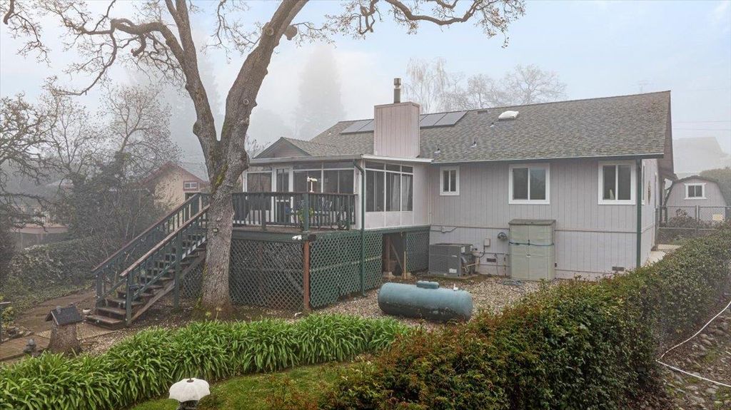 Welcome to 503 Hillcrest Avenue in Kelly Ridge! This custom 3-bedroom, 2-bath home offers a spacious open living area with high ceilings, wood floors, and abundant natural light. The oversized primary suite includes dual sinks and a walk-in shower. Enjoy the enclosed glass sunroom with a brand-new hot tub, portable AC, and tranquil views of the private, landscaped backyard featuring a waterfall, creek, pond, deck, and gazebo. Additional highlights include new HVAC, solar with low monthly payment, Cal Fire clearance, built-in garage storage, and a detached storage shed. Fully fenced and just minutes from Lake Oroville, Bidwell Marina, shopping, hiking and biking trails, and outdoor recreation.