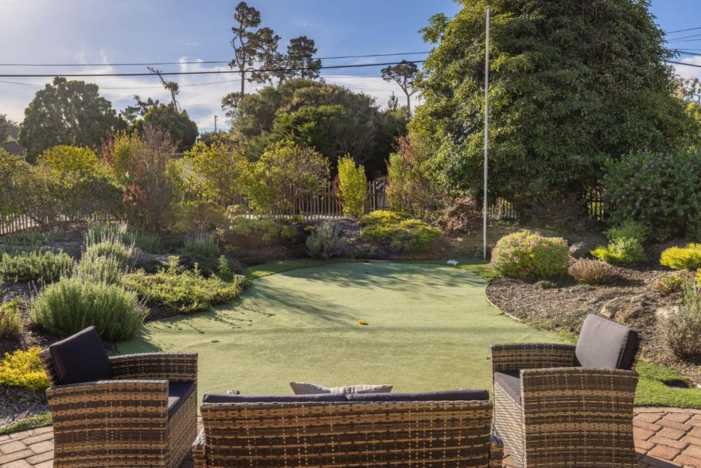 Charming Pebble Beach cottage in highly desired Country Club West. You will be impressed by the double fairway views of MPCC Shore #1 and Dunes #18 with strong peeks of ocean across to Santa Cruz Mountains. The front entrance includes a serene landscaped yard w/putting green and spacious paver patio perfect for relaxing or entertaining. The floor plan features a kitchen with abundant counter and storage space open to the dining area which flows to an oversized living room with wall-to-wall windows. Watch golfers going by while sitting in front of your fireplace or on the fully enclosed back patio with raised flowerbeds. Primary bedroom is ensuite while two guest bedrooms with large windows also enjoy expansive golf course views. Deep 2-car garage includes a separate laundry room and connects to a workshop which has lots of extra storage. Ideally situated 9,700 sqft lot offers a significant opportunity to expand if desired along with extra water credits. Here is your opportunity to live the Pebble Beach lifestyle within minutes of the MPCC clubhouse and ocean.