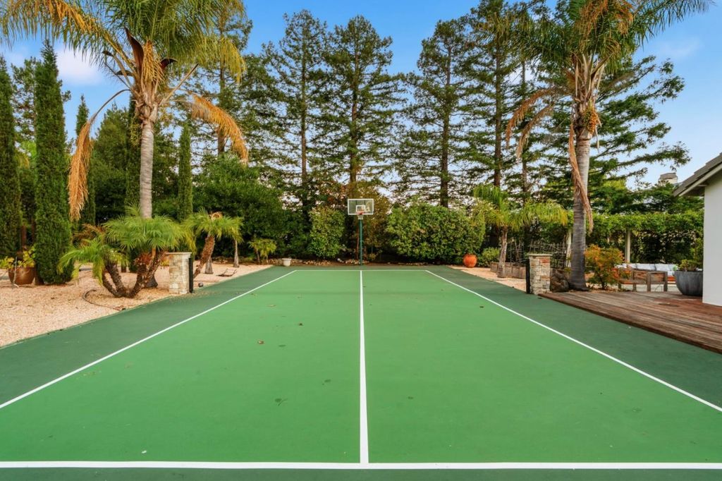 Set on a flat acre of gorgeously manicured grounds. This single story home borrows transitional architectural tones from the French countryside. The circular driveway leads up to a large 3 car garage. Five bedrooms that come with a separate guest house, sports court, large pool with covered grotto like spa, adjacent bath with changing room. Outdoor kitchen covered by a palapa, the perfect shade from natural elements while dining al fresco. Backyard is south facing and hosts the perfect weather all year long. The yard is an entertainers paradise. French oak engineered flooring throughout. Kitchen has an open layout with Thermador appliances and tuscan inspired limestone touches. Front living room has custom built shelving and cozy gas fireplace. Knotted Alderwood window and doors. Indoor surround sound. Generous master suite with walk in closet and wardrobes. Heated floors in bath and an oversized shower with tropical garden views. Enjoy the privacy this secluded subdivision provides. Hidden away, yet suburban enough hooked up to city sewer and close proximity to Sand Hill Road, Silicon Valley and San Francisco. Close to Menlo School, Sacred Heart Prep, Phillips Brooks, Woodside Priory amongst many other renown schools. Enjoy sunsets and the nature this lifestyle provides.
