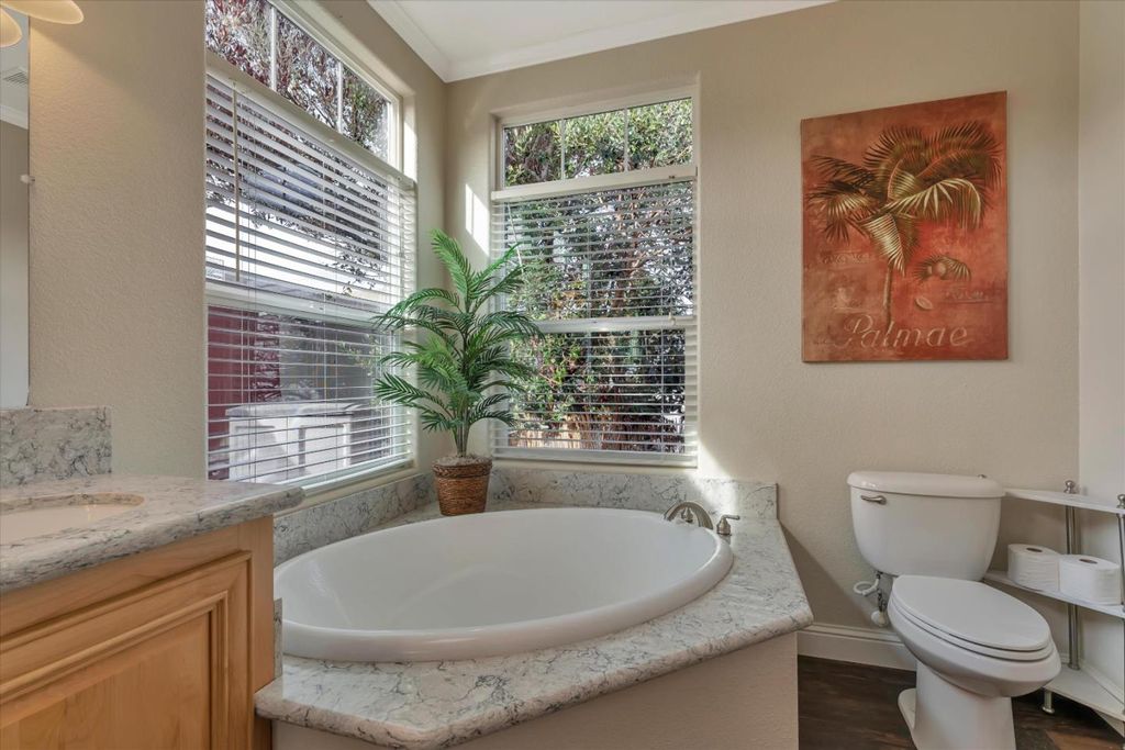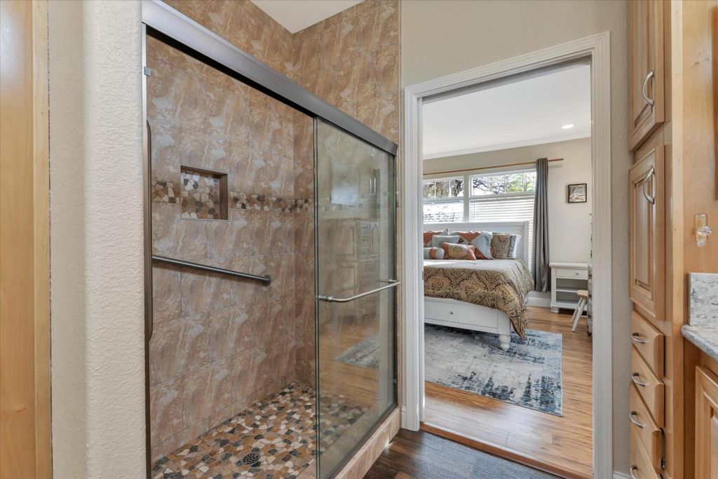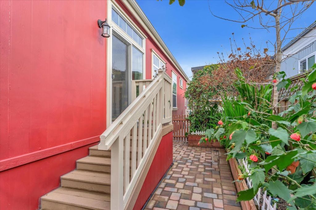 Forget everything you thought you knew about manufactured homes. This extra-large, custom-designed home immediately sets itself apart with generous square footage and thoughtfully chosen, high-quality finishes throughout. Flooded with natural light from skylights and vaulted ceilings, the interior feels open and airy. The chefs kitchen features high-end appliances, a large island, and beautiful granite and marble counters. Built-in bookshelves, woodgrain laminate flooring, and a fireplace add warmth and character. Sliding glass doors open to a lush, private garden. The front portion of the home includes two bedrooms, a custom bath, a separate living room, and two private entrances. An ideal set-up for extended household living or guests. Toward the rear, a spacious living room with fireplace, separate dining area, a wall of windows, and an expansive kitchen anchor the main living area. The primary suite features a walk-in closet and a luxurious bath with spa tub. Every inch reflects quality construction. Reports are clean.The home has been meticulously cared for. Alimur Park is a well-managed, resident-owned co-op community with a pool and charming clubhouse. All within walking distance to downtown Soquel, Capitola Village and Wharf, nearby beaches, and 41st Avenue shopping.