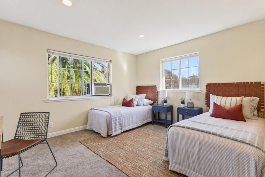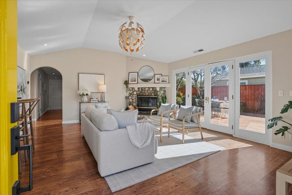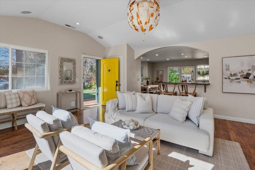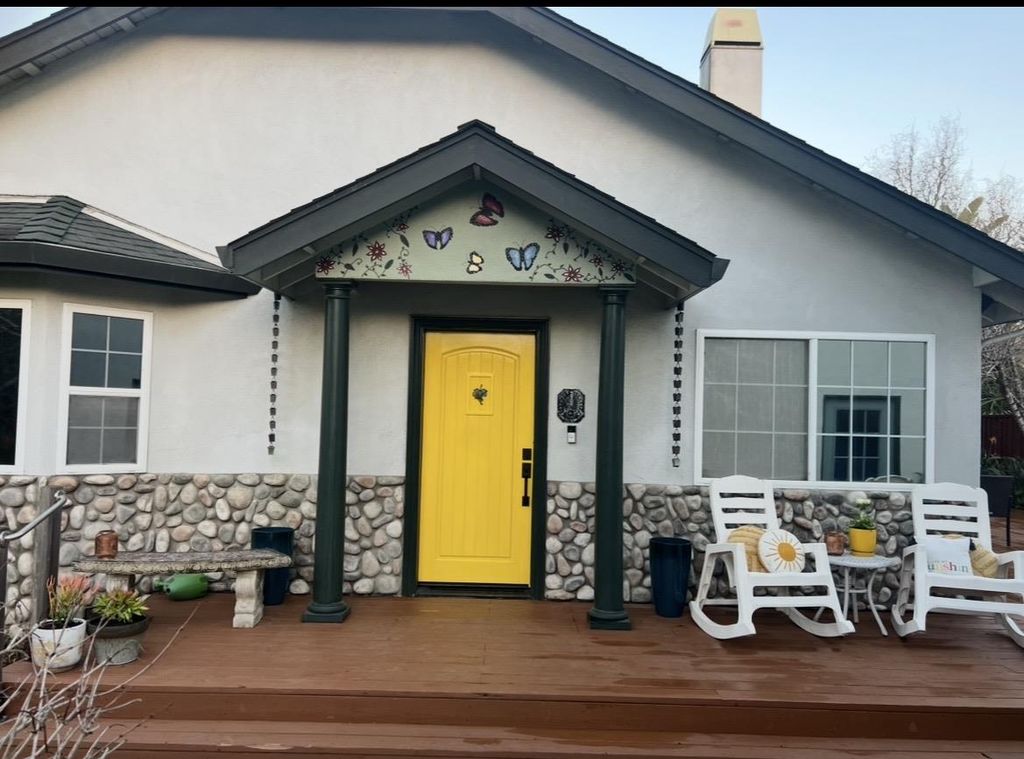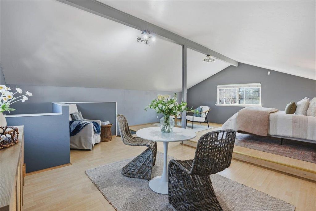 Coastal Butterfly Oasis a design-forward coastal retreat blending modern luxury and laid-back Santa Cruz living. Set on a 7,700+ sq ft lot, this home offers multiple outdoor living spaces, curated gardens, lush artificial turf, and expansive deck area for entertaining or unwinding in the ocean breeze. Artistic butterfly murals and a statement yellow front door lead into an airy, open-concept interior anchored by a striking river rock fireplace. The chefs kitchen features a large island, updated appliances, dual sinks, ample storage, and a built-in dining nook. The main level includes three bedrooms, including a primary suite with French doors to the yard and a spa-inspired bath. Upstairs offers flexible rooms ideal for a home office, media space, or guest retreat. A detached garage studio with a full bath adds incredible versatility for multigenerational living, guests, or remote work. Recent upgrades include owned solar panels, electric vehicle changing station, an on-demand water heater, and a newer high-efficiency furnace. Located just five blocks to Pleasure Point and walkable to top coffee spots and eateries. Creative, flexible, and effortlessly cool this is Santa Cruz living at its best.