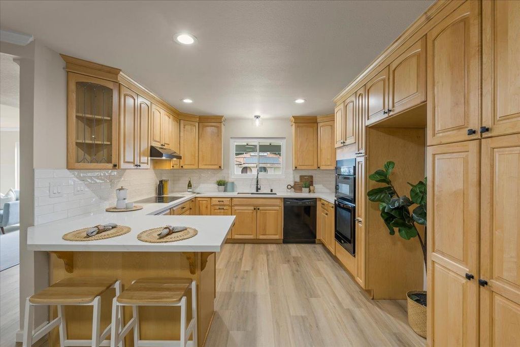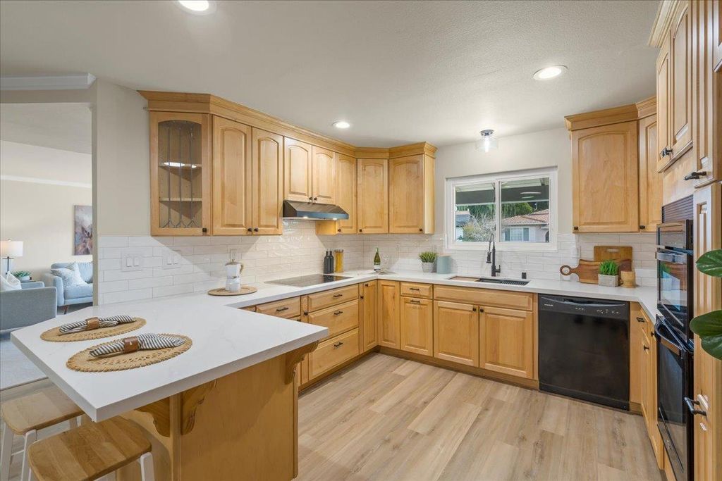 Great single story home in a nice cul de sac location. And so many new updates!! Terrific floor plan with living room, open kitchen to dining area, family room, 4 bedrooms and 2 full baths. The home is very light and bright with updated LED lighting, new light fixtures, fresh interior paint and new LVP and Karistan carpet. The kitchen has been transformed, with new quartz countertops, new tile back splash, a new ceramic induction cooktop, new hood, new black stainless sink, new GFCI's and a new faucet. There is new door hardware, new child proof electrical outlets, new light switches and switch plates, new closet doors and new dawn to dusk exterior lights. The front door has new hardware with a wifi enabled deadbolt and fingerprint entry feature. The primary bath includes a curb less shower for easy entry. The backyard is private, with a nice patio and easy maintenance artificial turf. The 2 car garage is oversized with an automatic opener.
