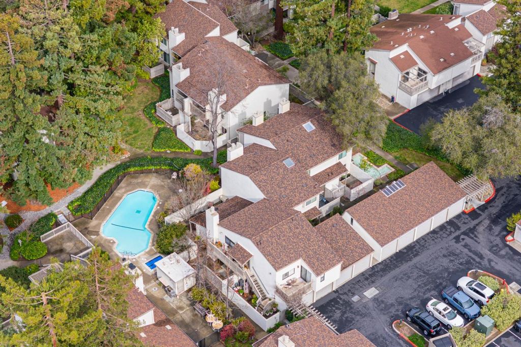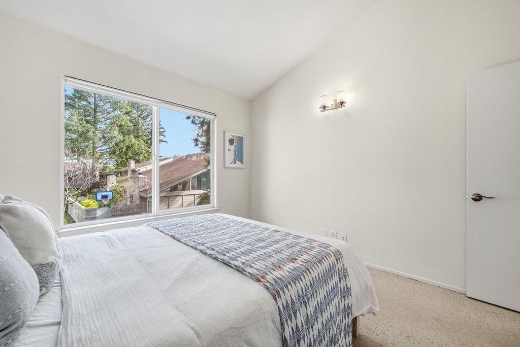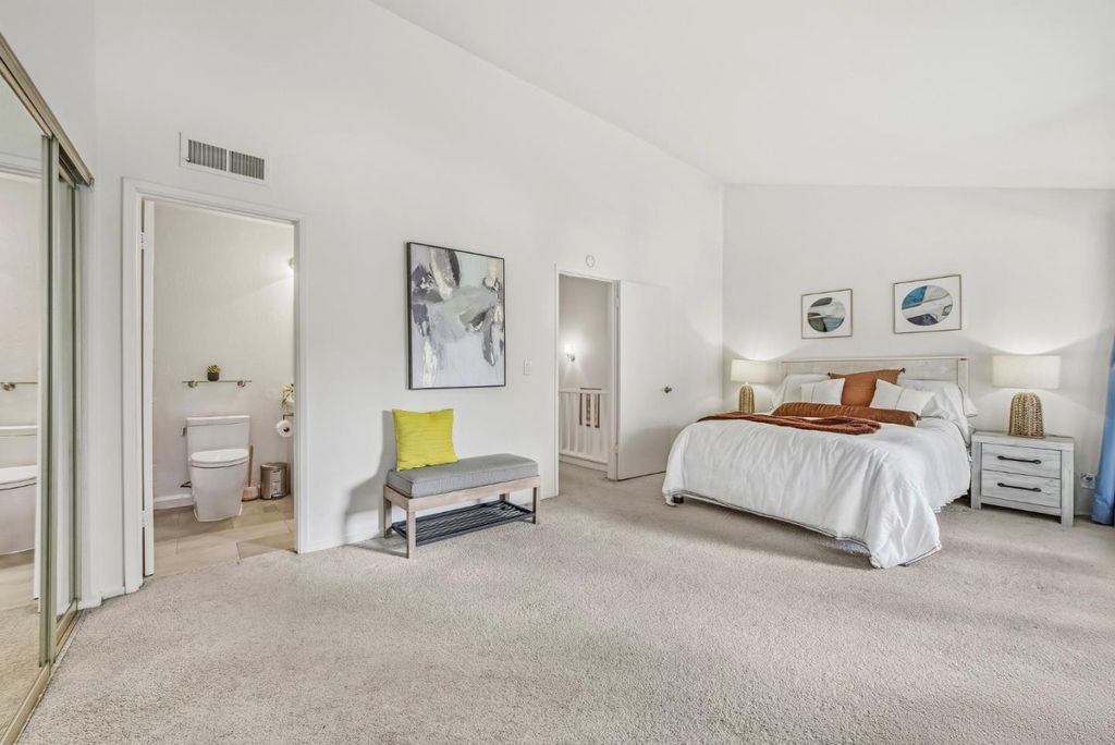 Beautifully updated 3-bedroom, 2.5-bath townhouse in the sought-after Vineyard community of Saratoga. This light-filled home features inviting open living area with recessed lighting, wide-plank style flooring, and cozy fireplace that creates a warm, modern atmosphere. Large sliding doors enhance natural light and provide seamless indoor-outdoor flow. The modern kitchen offers crisp white cabinetry, quartz-style countertops, stainless steel appliances, and generous workspace for everyday living and entertaining.Upstairs, the oversized primary suite boasts volume ceilings, abundant natural light, and private deck for outdoor relaxation. Roomy secondary bedrooms showcase vaulted ceilings, adding openness and architectural character. Residents enjoy resort-style amenities including pools, clubhouse facilities, and beautifully maintained grounds with scenic landscaping and water features. Conveniently located with easy access to Highway 9/85/280 and just minutes from downtown Saratoga, shopping, dining, and top schools. Enjoy low-maintenance living in a highly desirable community.