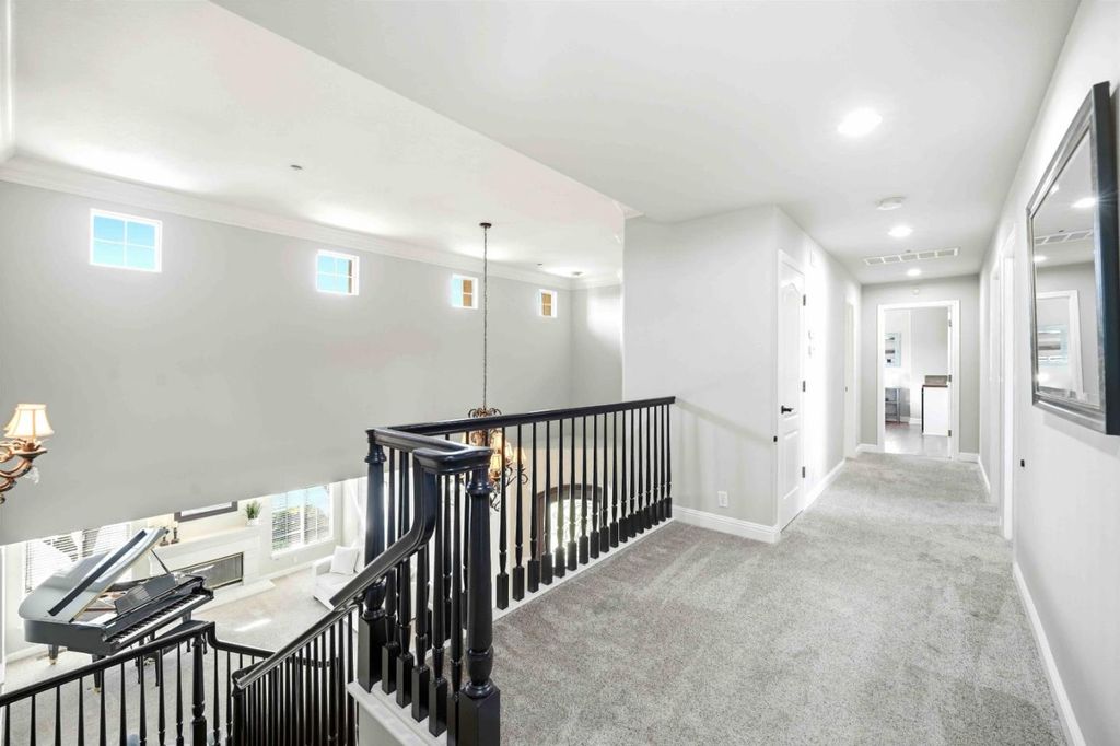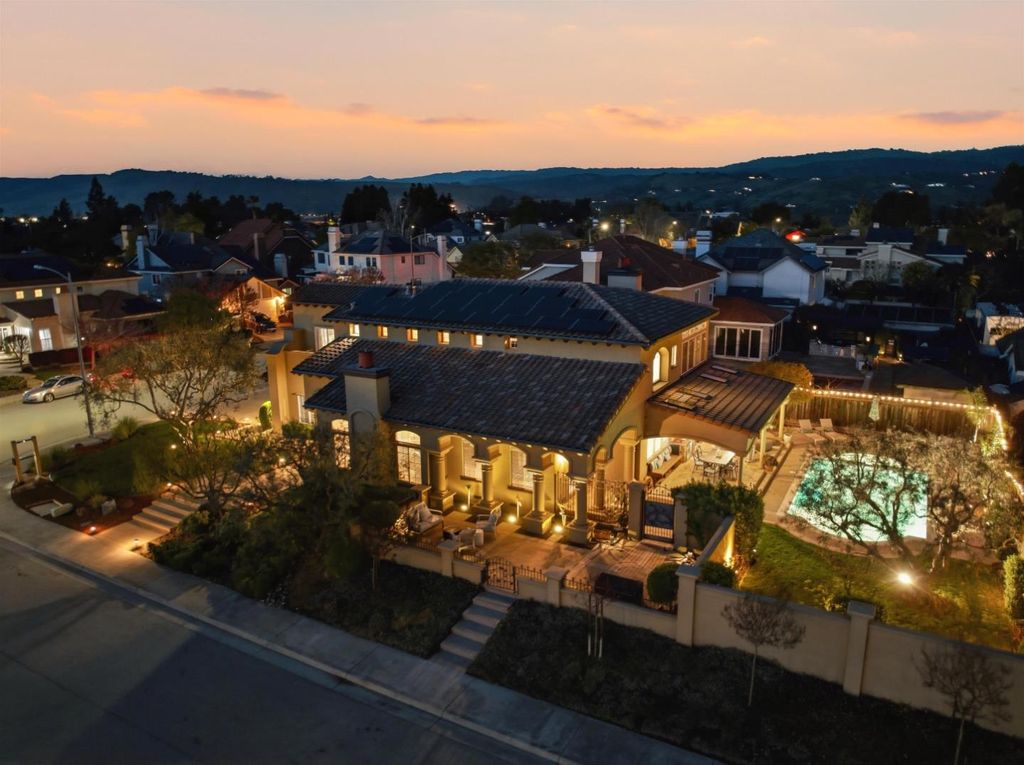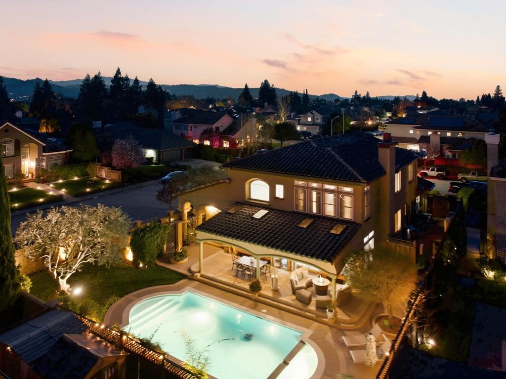 Perfectly blending timeless charm with modern updates, this 5-bed, 3-bath home offers comfortable living and entertaining, starting with a grand entry and elegant interiors. The recently updated kitchen boasts stainless steel appliances, a double oven, wine cooler, and granite island. Refinished hardwood floors flow through the main level, leading to soaring ceilings and cozy living spaces with fireplaces in both the living and family rooms. The formal dining room is ideal for special occasions, while the family room's wet bar enhances gatherings. A versatile downstairs bedroom with French doors and built-in shelves, currently used as an office, adapts to your needs. Upstairs, the primary suite is a true retreat, featuring a sitting area, spa-inspired ensuite with a jet tub, double sinks, and a walk-in closet. Additional bedrooms are spacious and inviting, providing comfort for family and guests. Outside, the private backyard oasis includes a covered patio with a dry bar, along with a sparkling pool and spa - perfect for relaxing or entertaining. Situated on a large 10,454 sq ft corner lot with ample guest parking, this home is just a short stroll from charming downtown Morgan Hill, where boutique shopping, dining, and community events await!