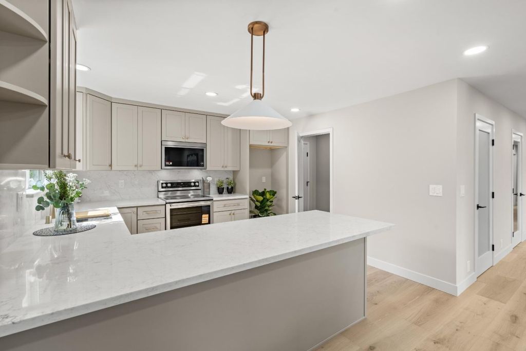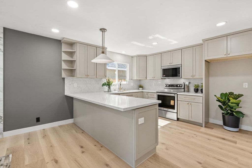 Beautiful Almaden Valley home offers a lifestyle of ease & comfort with Top schools. Completely remodeled in 2026 with permitted interior renovation and reconfiguration, this exceptional Almaden Valley home offers 4 bdrms/3 full baths on a spacious 7,980 sq ft lot. The open-concept layout creates modern comfort and functionality. * The exquisite kitchen features quartz countertops, white cabinetry, stainless steel KitchenAid appliances, abundant natural light. Stylish bathrooms showcase high-end finishes and glass enclosures. Upgrades include engineered wood flooring, LED recessed lightings, AC, new subpanel, energy-efficient windows, new interior doors, electric fireplace w/porcelain feature wall, enclosed laundry area, a finished 2-car garage w/epoxy flooring, WiFi-enabled opener, and extra-wide driveway.* Exterior improvements include a new concrete floor in the front porch, a spacious backyard deck, paver side yard, refreshed landscaping, and new paint. The large private backyard is perfect for entertaining or enjoying peaceful mornings with sunrise views of the east hills. Roof replaced in 2020.* Ideally located on a quiet street off McAbee Road with no direct rear neighbors. Minutes to parks, Almaden Library, Safeway, Whole Foods, Oakridge Mall, dining, and Highways 85/87.