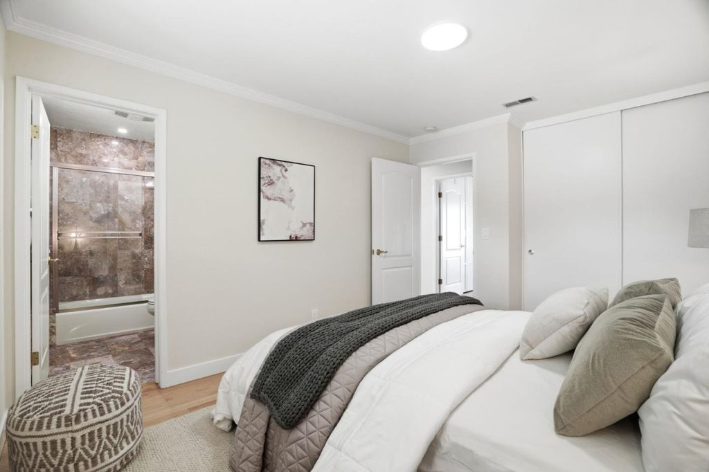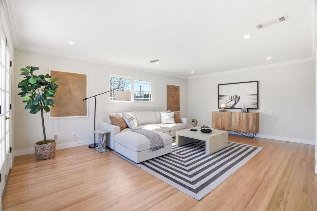 Lovingly maintained by its current owner for nearly two decades this move-in ready and beautifully improved, this spacious Birdland home offers two ensuites one on each level ideal for multi-generational living and privacy. The upstairs ensuite might be the most expansive ensuite you've ever seen in Sunnyvale, directly above the garage, also offering a walk-in closet and updated dual-sink bathroom. Just a short walk to Apple Campus, Raynor Park, and 10/10-rated Laurelwood Elementary, the home features a refinished 2-car garage with epoxy flooring and a generous living area with refinished solid oak hardwoods, in-ceiling lighting, central HVAC, Andersen windows, and crown moulding. The modern kitchen showcases Taj Mahal countertops, new stainless appliances, gas range with a powerful 1,200cfm range hood for serious cooking. The main level includes three bedrooms and two baths, including a marble-tiled ensuite, with sliders opening to a large backyard patio & powered outbuilding ideal for a future office or ADU. Lovingly maintained for nearly 20 years on a nearly 7,000sf lot, this home offers prime access to major tech campuses, commute routes, & upscale dining at Cupertino Village. This is an exceptional opportunity in one of Sunnyvale's most desirable sought after neighborhoods.