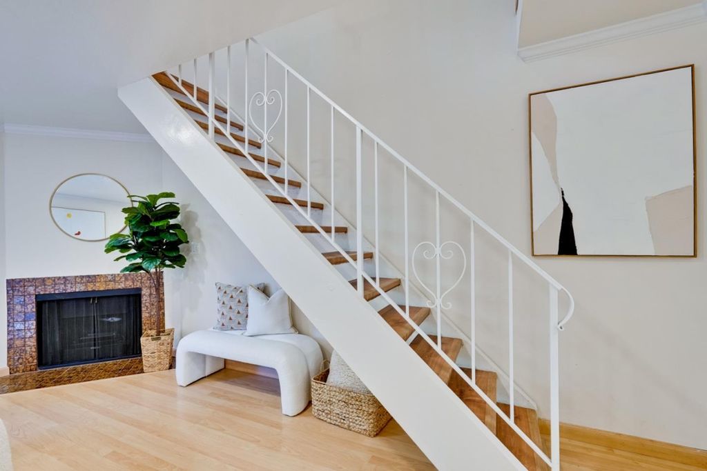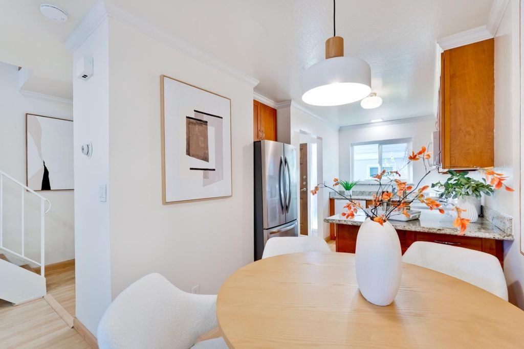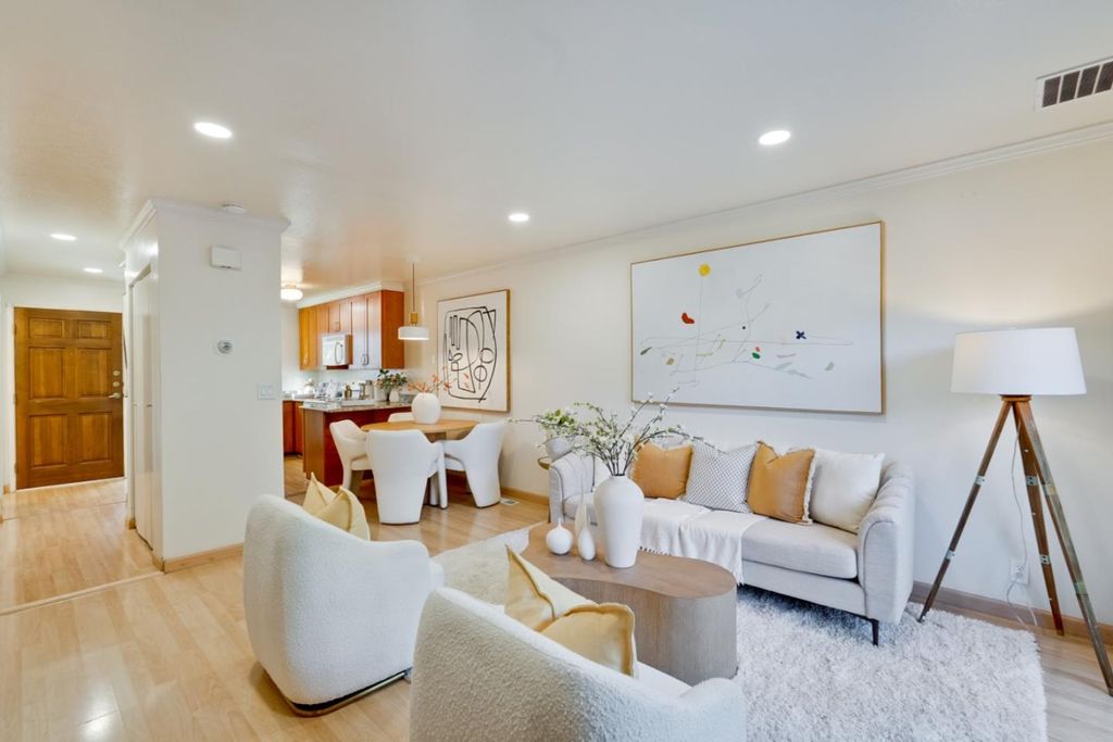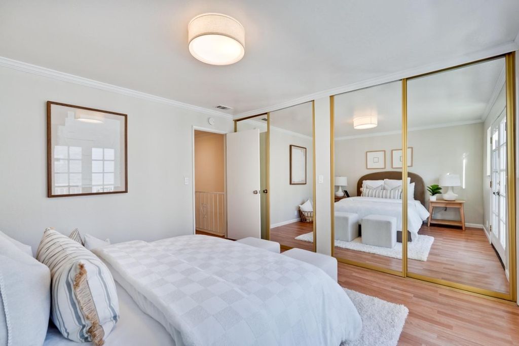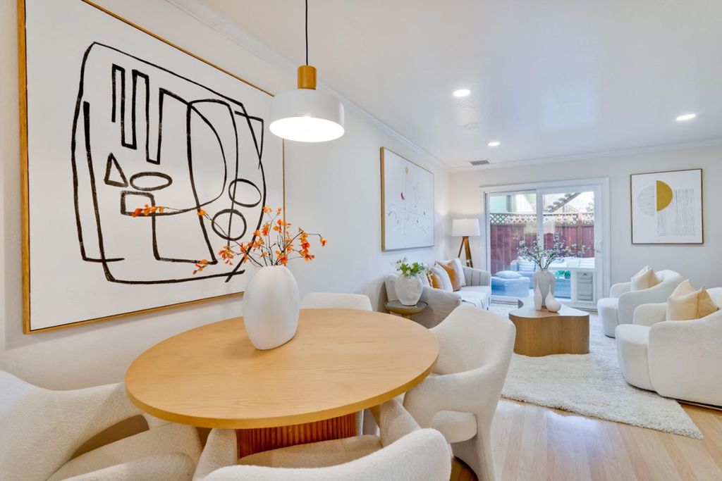 Stunning move-in ready condominium nestled within a private gated community in prime Redwood City location! Recently updated with fresh paint, new doors and light fixtures throughout, the inviting and thoughtfully designed floor plan seamlessly connects the kitchen, dining area and living room for everyday living, social gatherings and guest entertaining. Stylish kitchen is complete with bright window, stainless steel refrigerator, beautiful granite countertops, and an abundance of cabinetry for storage. Spacious living room with modern recessed lights showcases an elegant corner fireplace and attractive sliding glass door to allow in plentiful natural light and leads to the private back patio with welcoming deck for a serene atmosphere to relax, study or play. Primary bedroom features two mirrored closets and classic french doors open to the balcony offering pleasant exterior views. Other outstanding amenities include indoor laundry, well-proportioned secondary bedroom with ample closet space, decorative crown molding, and two designated parking spaces. Community includes a pool and lush greenbelt. HOA fee covers common area maintenance, exterior, and roof. Conveniently located to parks, dining, and major commute routes.