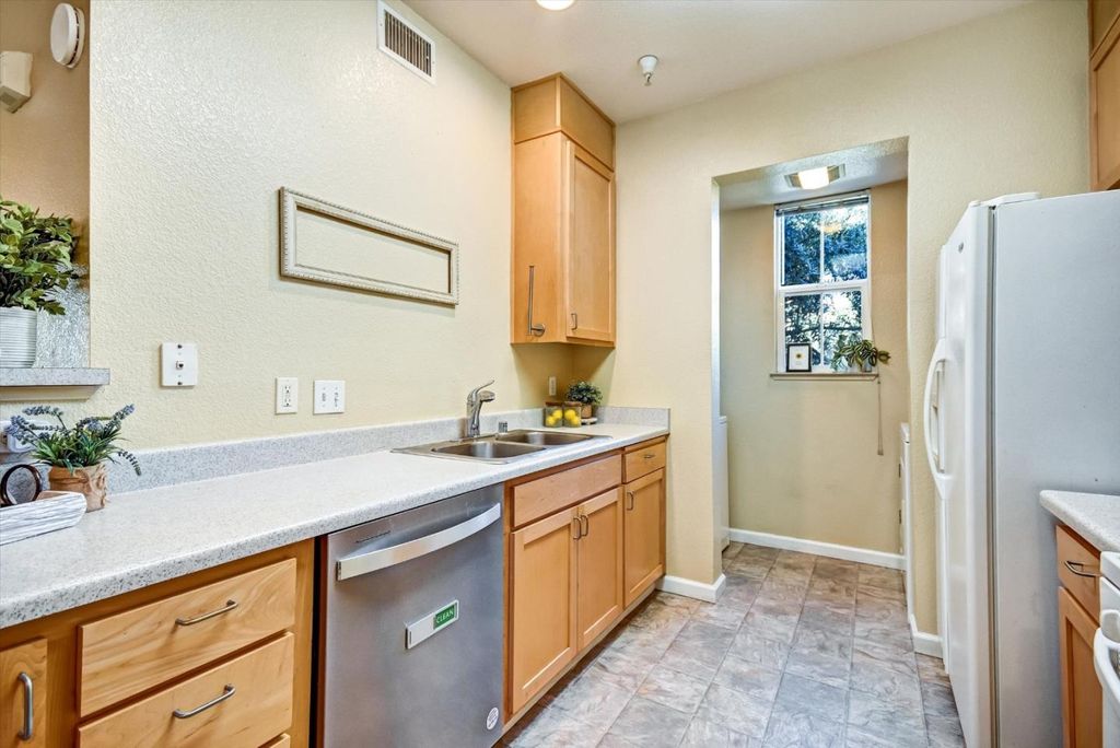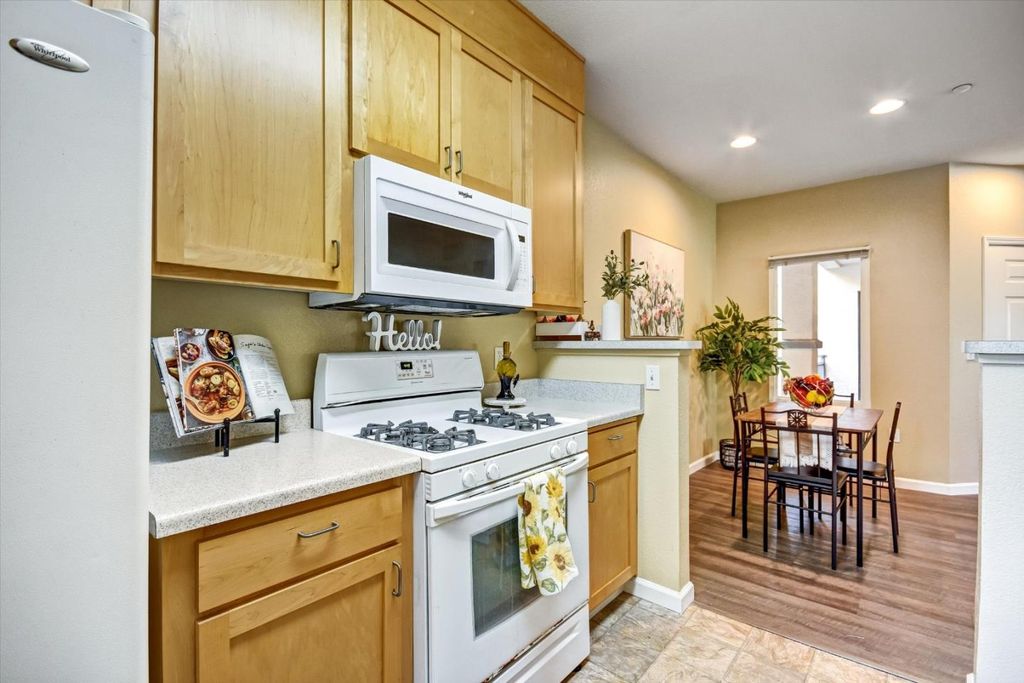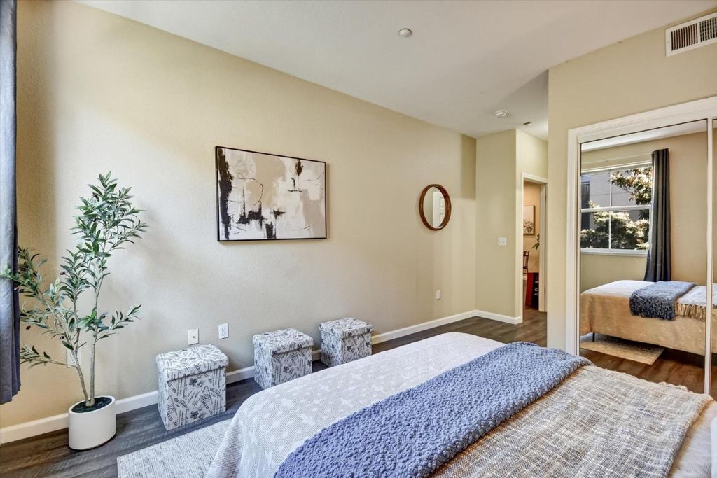 TWO bedrooms, with AC, a Private Garage, INDOOR Laundry, GAS Stove, Private Patio, Only shares ONE WALL, DUAL PAINE windows, Lux Laminate floors (HOA Approved), Convenient San Jose location and the quietest spot in the community...what more could you want!? Easily accessible by elevator or stairs this CORNER-END unit offers a smart split-bedroom layout with bedrooms on opposite sides for privacy. Open living spaces filled with natural light. Stay comfortable year-round with air conditioning and central heating. Parking is effortless with a PRIVATE garage and guest parking. HOA ALLOWS RENTALS, making this home a great residence or investment. This commute-friendly location offers fast access to highways 101, 280, 880, and 680. Community perks include BBQ areas, play area, and beautifully maintained courtyards, with shopping, dining, and parks just minutes away. Modern, functional, and centrally located - this San Jose gem is a must see! My lender at CrossCountry says this home qualifies for $17,000 grant that can be used towards closing costs/rate buy down. Flyers at the property with information.