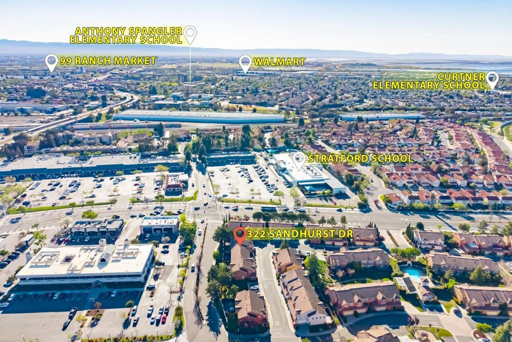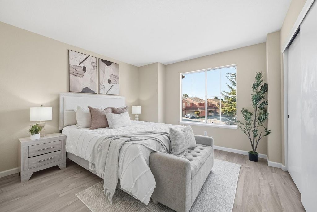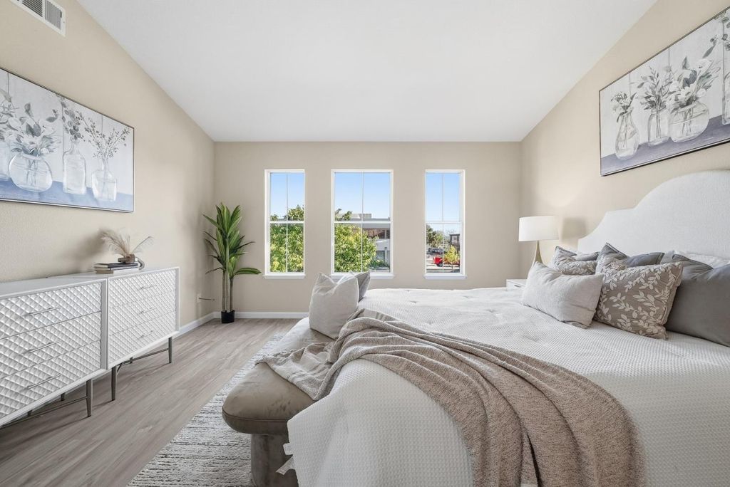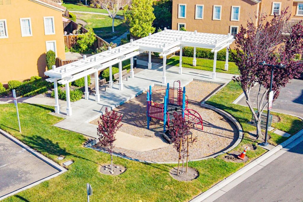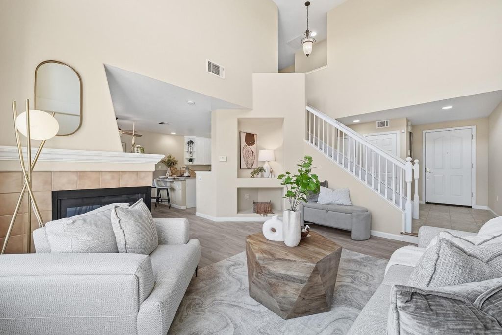 Welcome to this charming two story PUD ownership 3-bed, 2.5-bath townhouse with backyard in Milpitas. Upon entry, youre greeted by a bright living room with soaring ceilings, large windows, and a cozy fireplace. The gourmet kitchen features quartz countertops with a breakfast bar, stainless steel appliances, and ample white cabinetry, flowing into the dining area with a ceiling fan/light. There is a door to the rare, spacious fenced backyard, offering seamless indoor-outdoor living. A convenient half bath completes the main level. Upstairs, the primary suite boasts a spacious bedroom with large windows and an en-suite bath with double vanity and shower over tub. Two additional bedrooms and a hallway bath with double vanity and shower over tub provide space for family or guests. Attached garage. Enjoy the community pool and close proximity to dining, grocery (Safeway, 99 Ranch), and shopping (Great Mall). Near BART and with easy access to Highways 237, 680, and 880, plus a short commute to major tech companies. Great public schools and nearby Stratford private school. Do not miss this great opportunity!