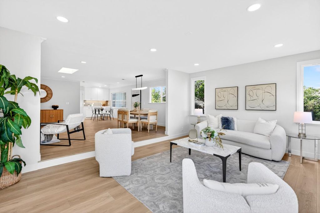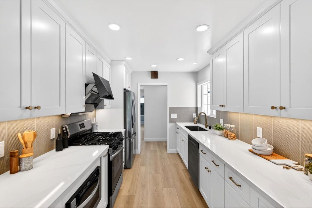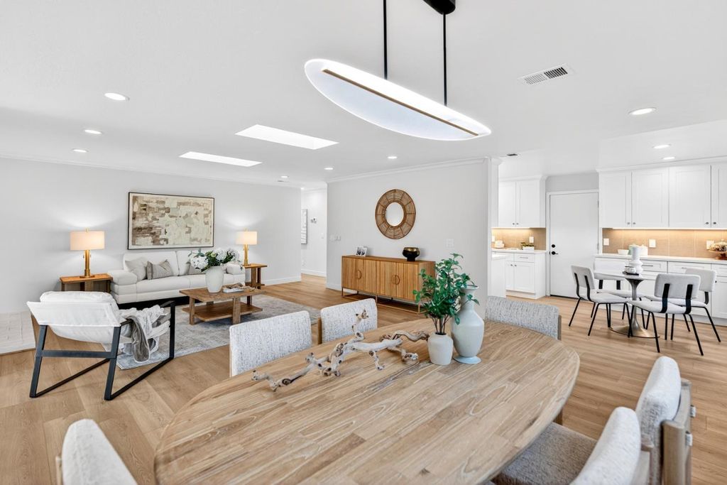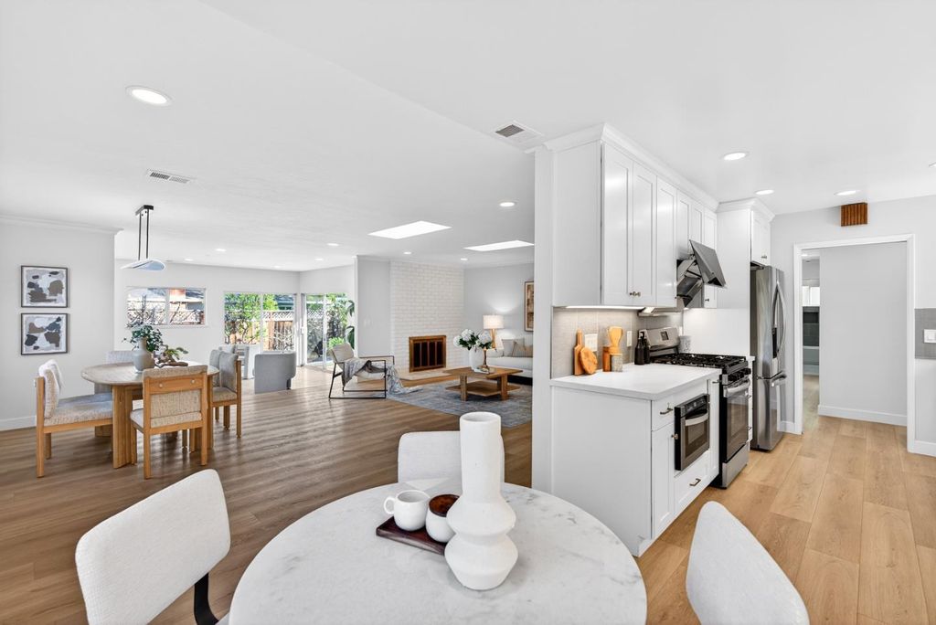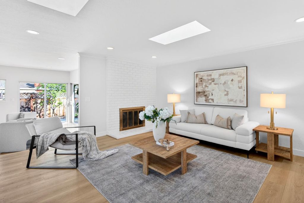Newly remodeled and tucked away on a calm cul-de-sac in a highly sought-after neighborhood near the Cupertino and Los Altos borders, this exceptional home blends modern comfort with an unbeatable location. Just steps from Top-Rated Cupertino schools, the renowned Serra Park and Homestead Crossing shopping center. Inside, new luxury vinyl plank flooring runs throughout a bright, freshly painted and thoughtfully designed floor plan, with vast natural light pouring in through dual-pane windows and skylights. Recessed lighting and a cozy wood fireplace create a warm, refined living space. The dining area flows seamlessly into a sleek, updated kitchen featuring stainless steel appliances, quartz countertops and ample cabinetry. All bedrooms are comfortably-sized with their own closets, while the primary suite offers a large walk-in closet and en-suite bathroom. Additional highlights include a two-car garage with washer/dryer and sink, upgraded electrical main panel (200A), along with a step down family room that opens to a newly landscaped backyard with lush greenery. Ideally located near Silicon Valleys leading tech campuses including LinkedIn, Apple, and Meta, with easy access to Highways 85, 280, and Caltrain. Do not miss your chance to own this golden gem. It will go FAST!