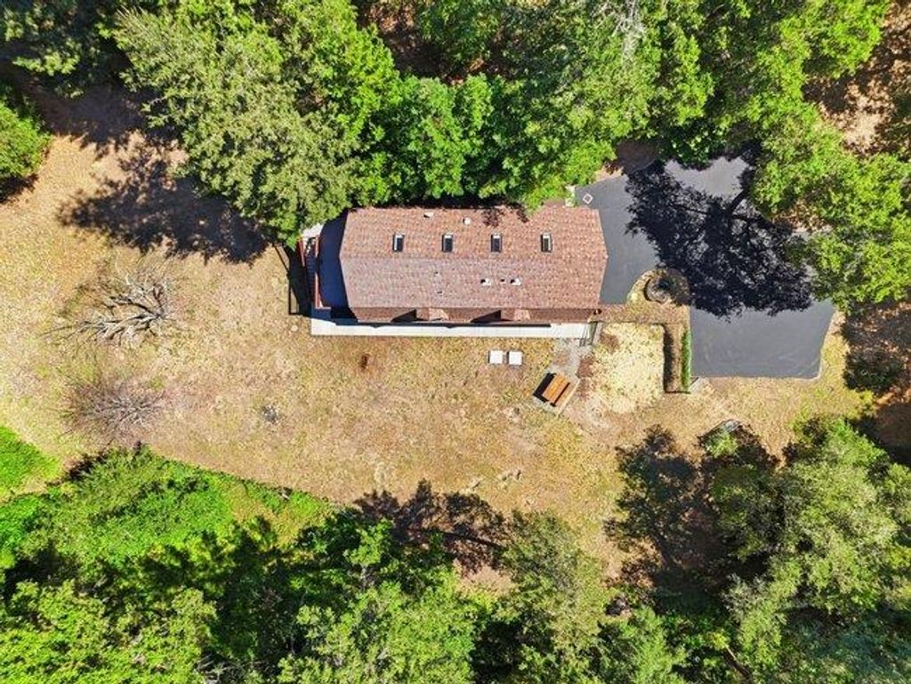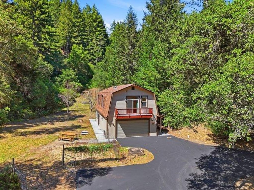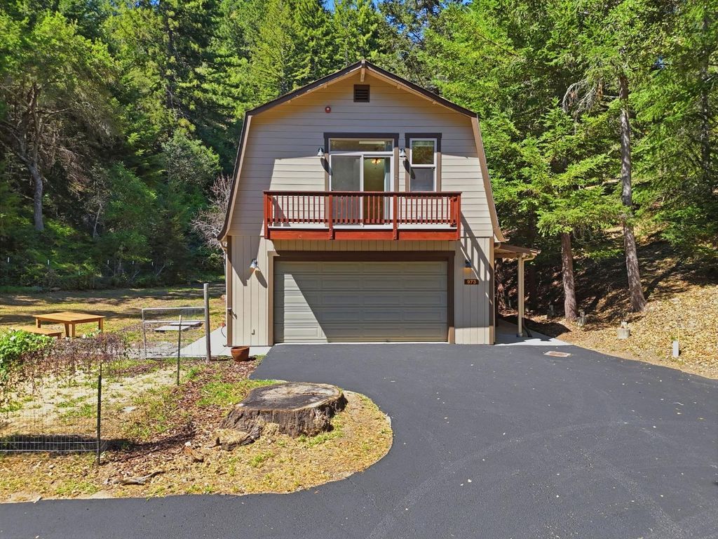 Welcome to "Sunlit Glen", a Carmel-style family compound nestled on 2.91 sunny acres above Scotts Valley. Gently terraced grounds, winding pathways, and multi-level gardens create a private and peaceful setting. The main home is approx 1600sf, 3 bedrooms/2 baths. The family room has a beautiful floor-to-ceiling stone fireplace with fireplace insert. The kitchen has a new gas range, stainless steel appliances, ample storage, and a breakfast nook with garden windows. The primary bedroom has a fireplace and en-suite bath. Two additional bedrooms off the kitchen wing share a bathroom that also serves as a laundry room. The kitchen door leads to the 2-car detached garage. Also located on the property is a separate ADU - a private 2-story barn conversion with its own driveway, utilities, and address (973). It offers a modern kitchen with pantry, family room, and a large bedroom with a walk-in closet and en-suite bath. At the lower level is a two-car garage, bathroom, and flexible space for storage or gym. In the adjoining meadow there is room for an orchard, gardens, and/or animals. At the main entrance of the property stands the original Weston Road gate - a historical artifact. "Sunlit Glen" is a special property and is now ready for its new owners to enjoy for generations to come.